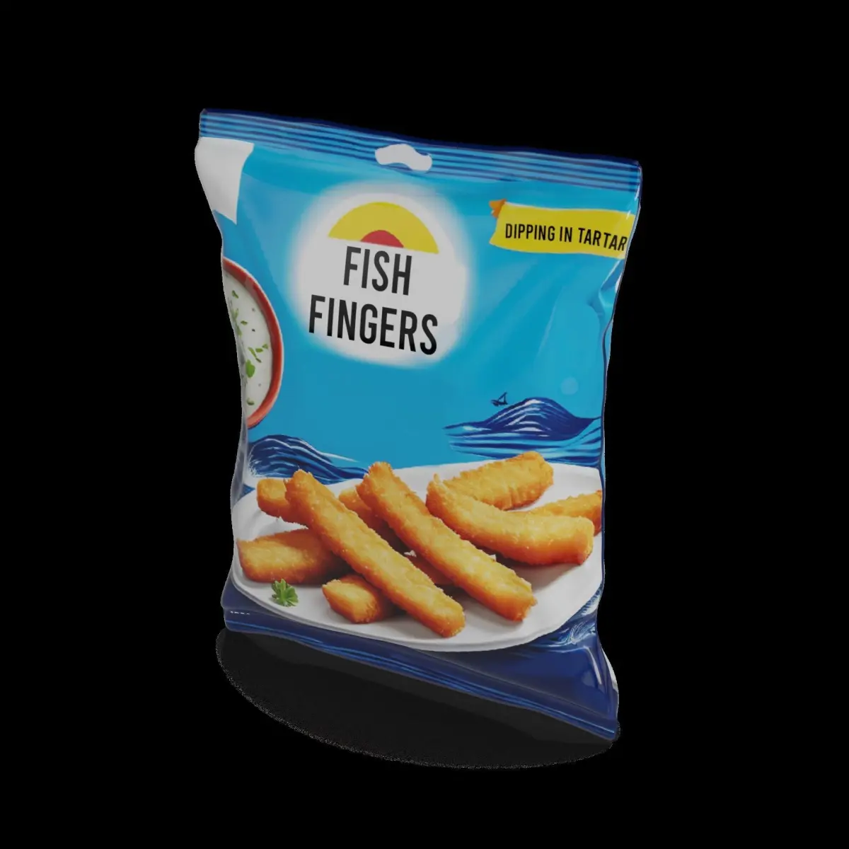 Fish Fingers: Dive into a seafood delight with our Fish Fingers. The packaging is a vibrant blue bag, featuring an image of crispy fish fingers. It is resealable, allowing you to enjoy these delicious fingers whenever you want. Inside, you'll find tender fish fillets coated in a crispy breadcrumb coating. They are perfect for dipping in tartar sauce or enjoying with a side of fries. Size: 400g.