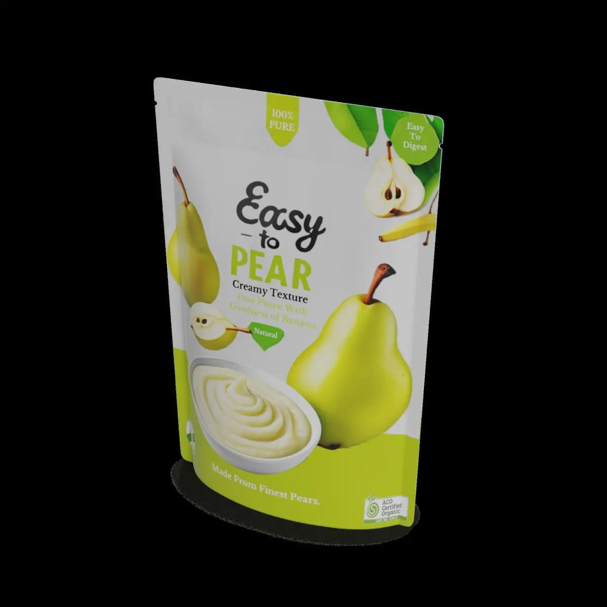 Pear Banana Puree: Enjoy the delicate flavor of pears combined with the creamy texture of bananas in this puree. The packaging is a light green pouch with an illustration of a pear and a banana, along with the text Easy to digest to appeal to parents looking for a gentle option.