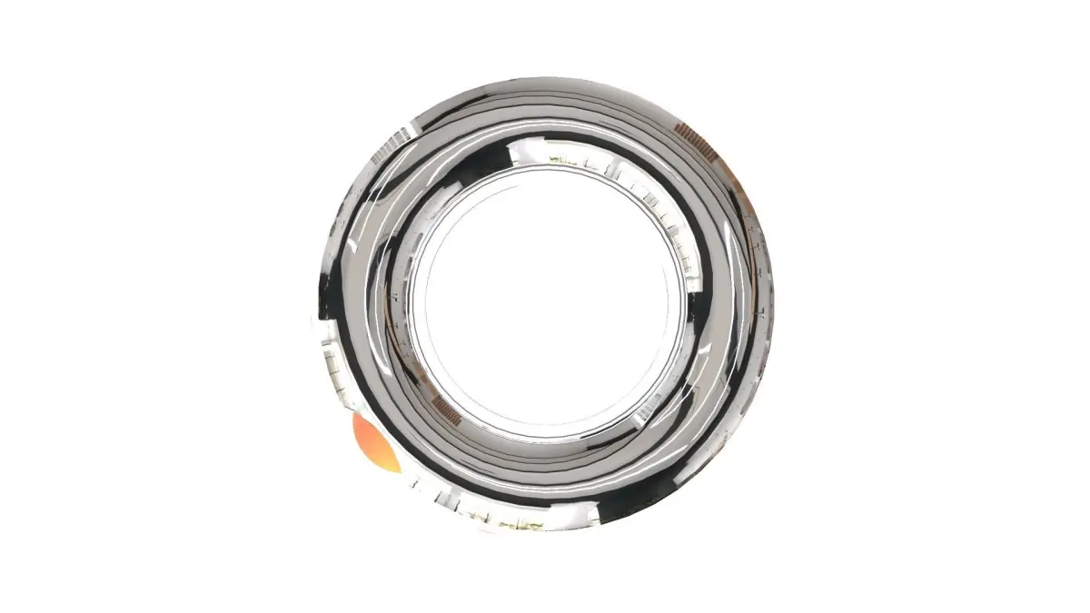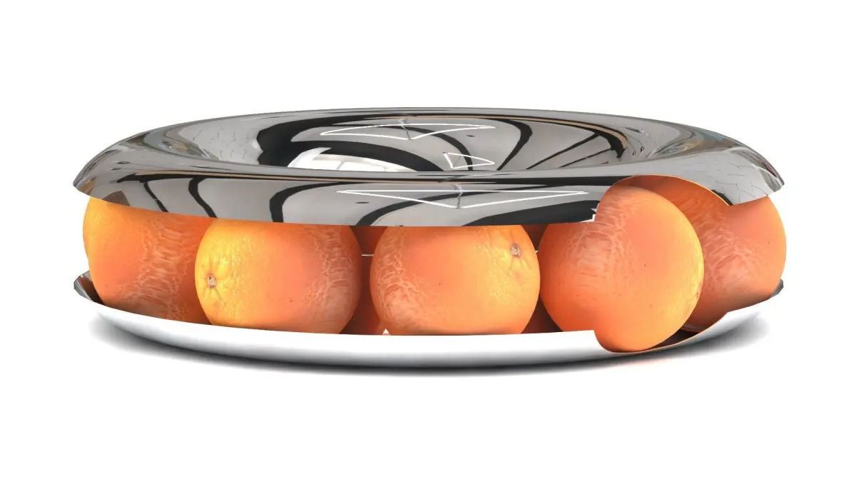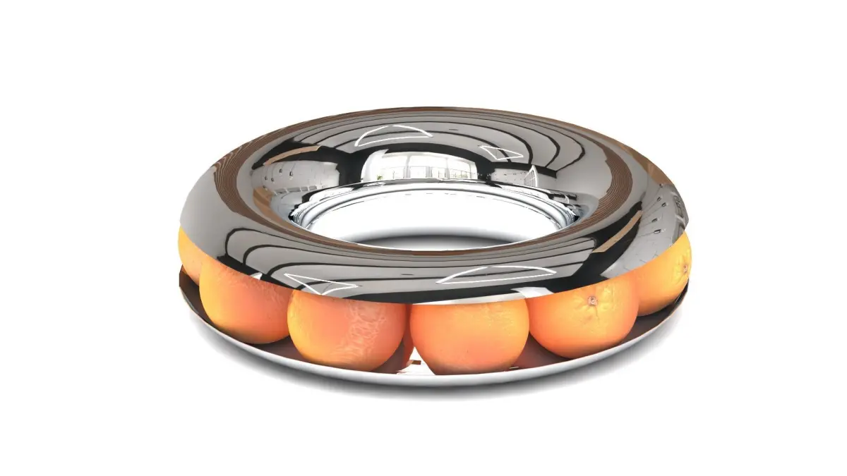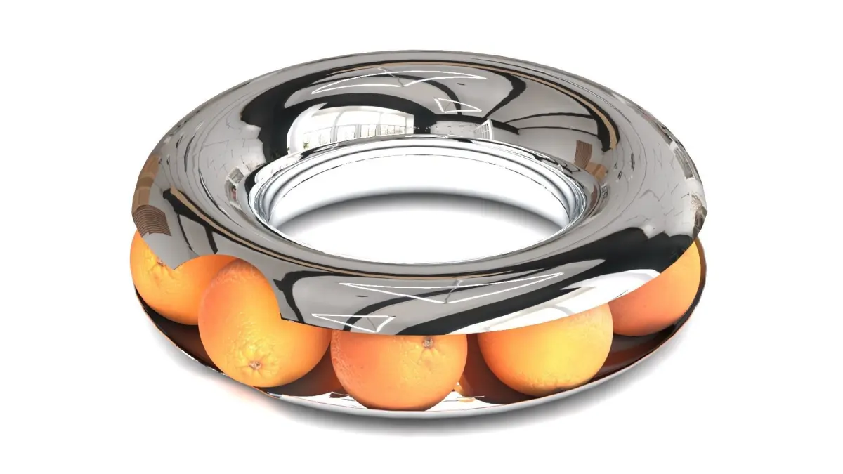 Eye-catching donut-shaped polished stainless steel fruit dispenser design inspired by an innovative Italian designer