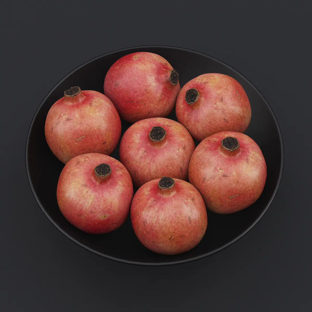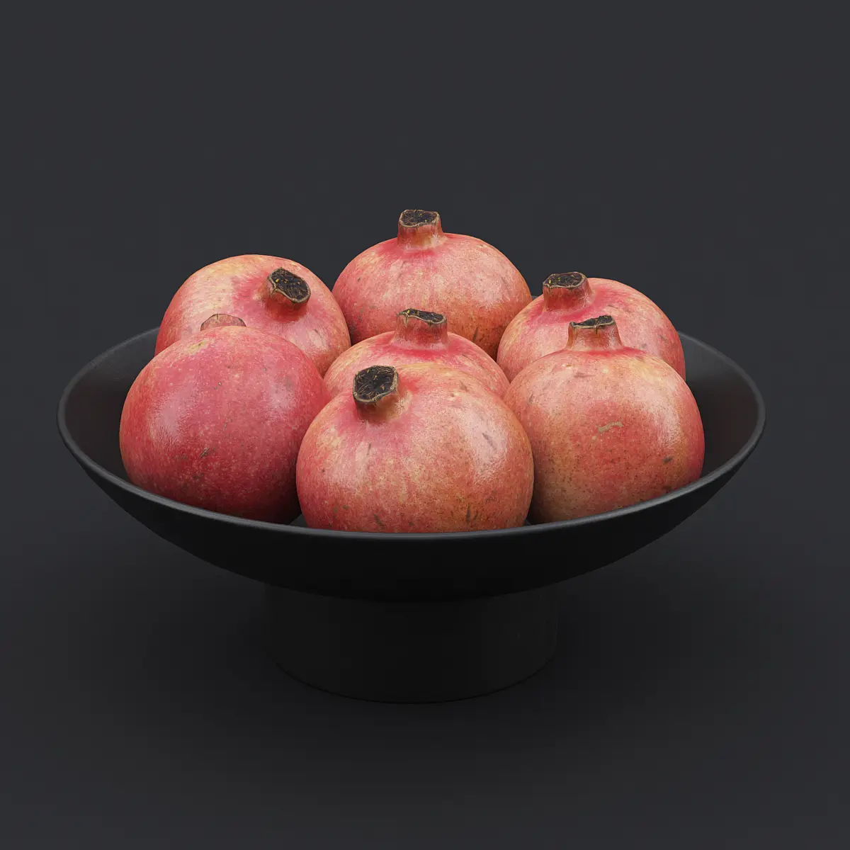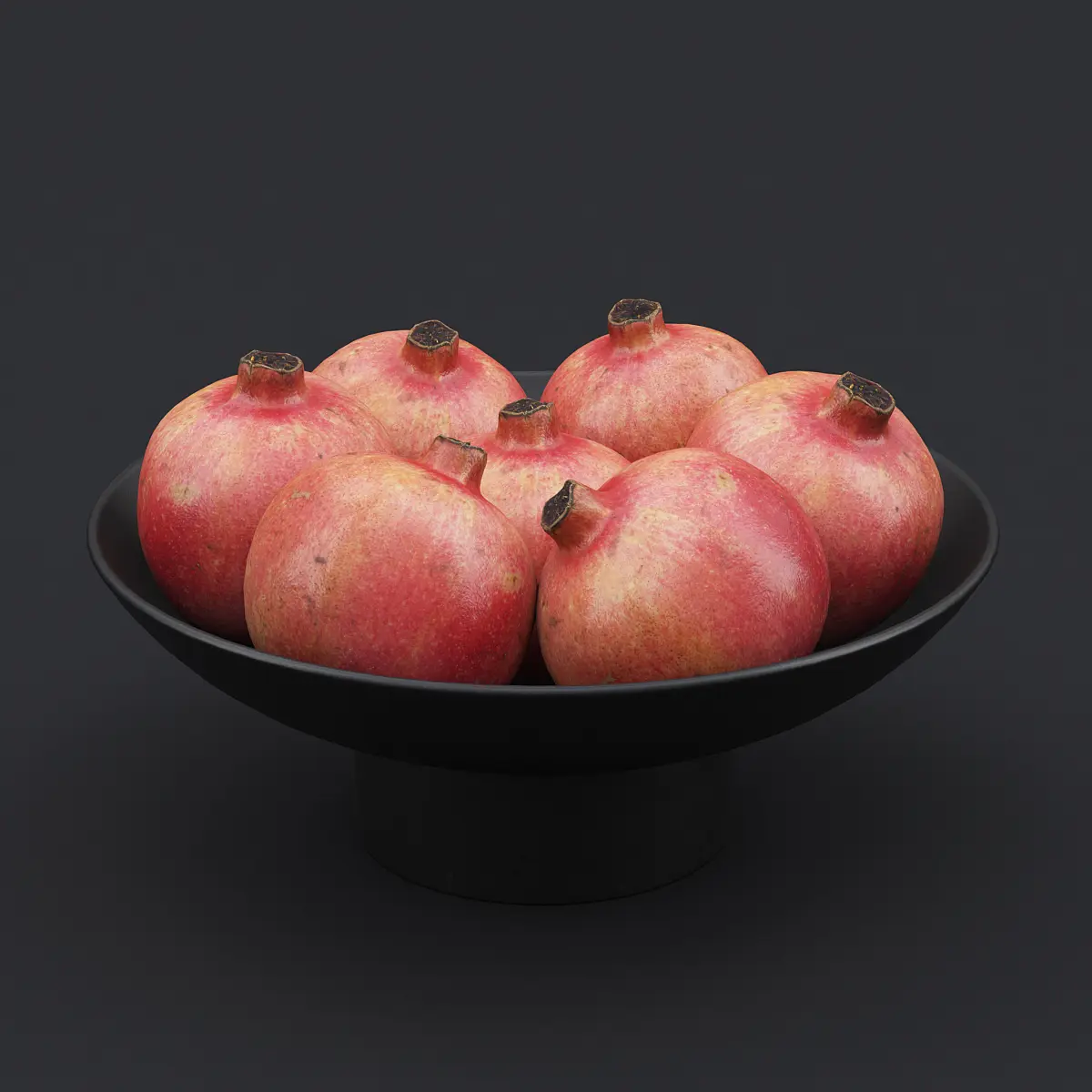 Black ceramic fruit bowl with photogrammetry scanned pomegranates.
