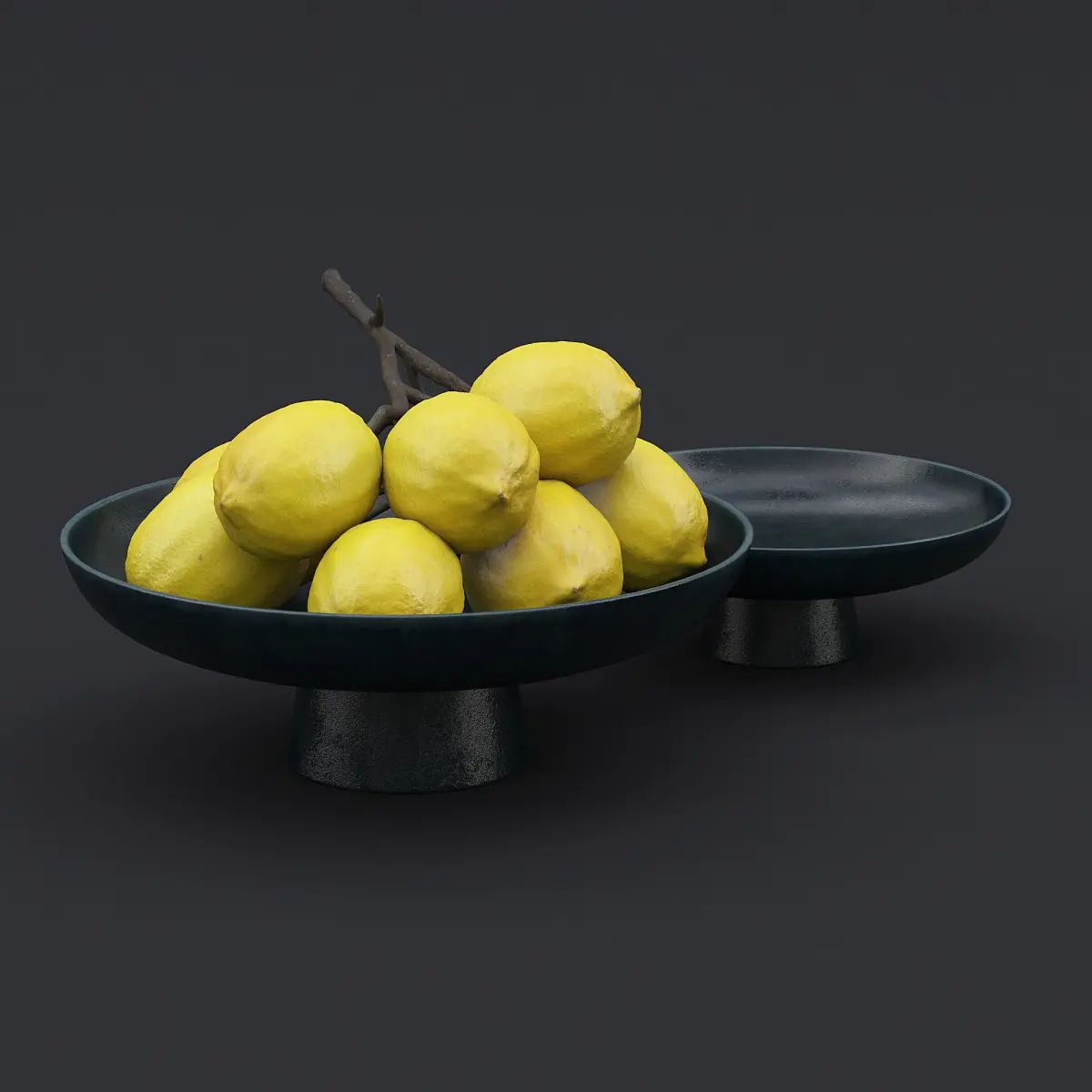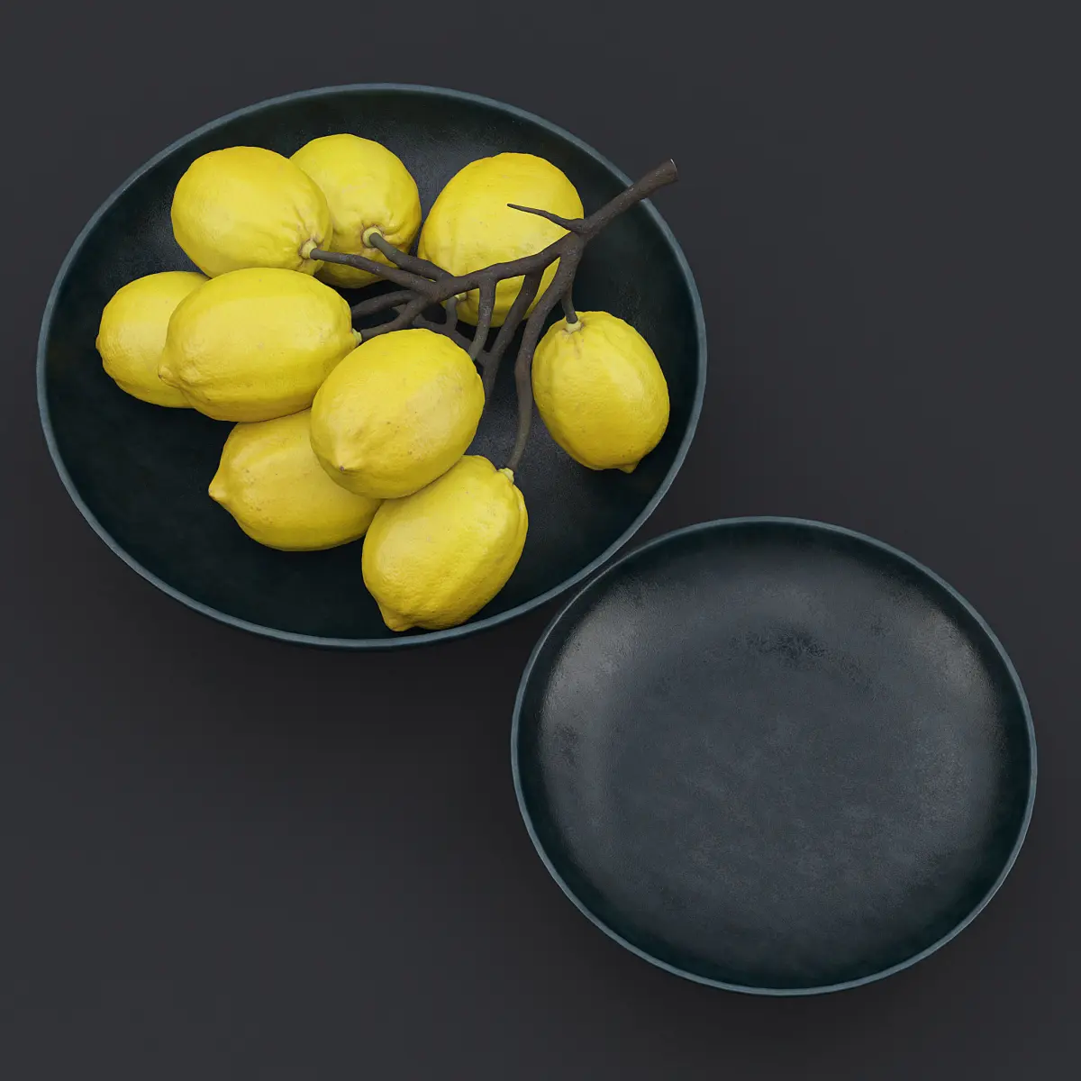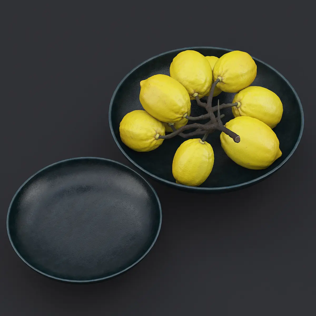 Two dark ceramic bowls with one of them with lemon branch with photogrammetry scanned lemons.