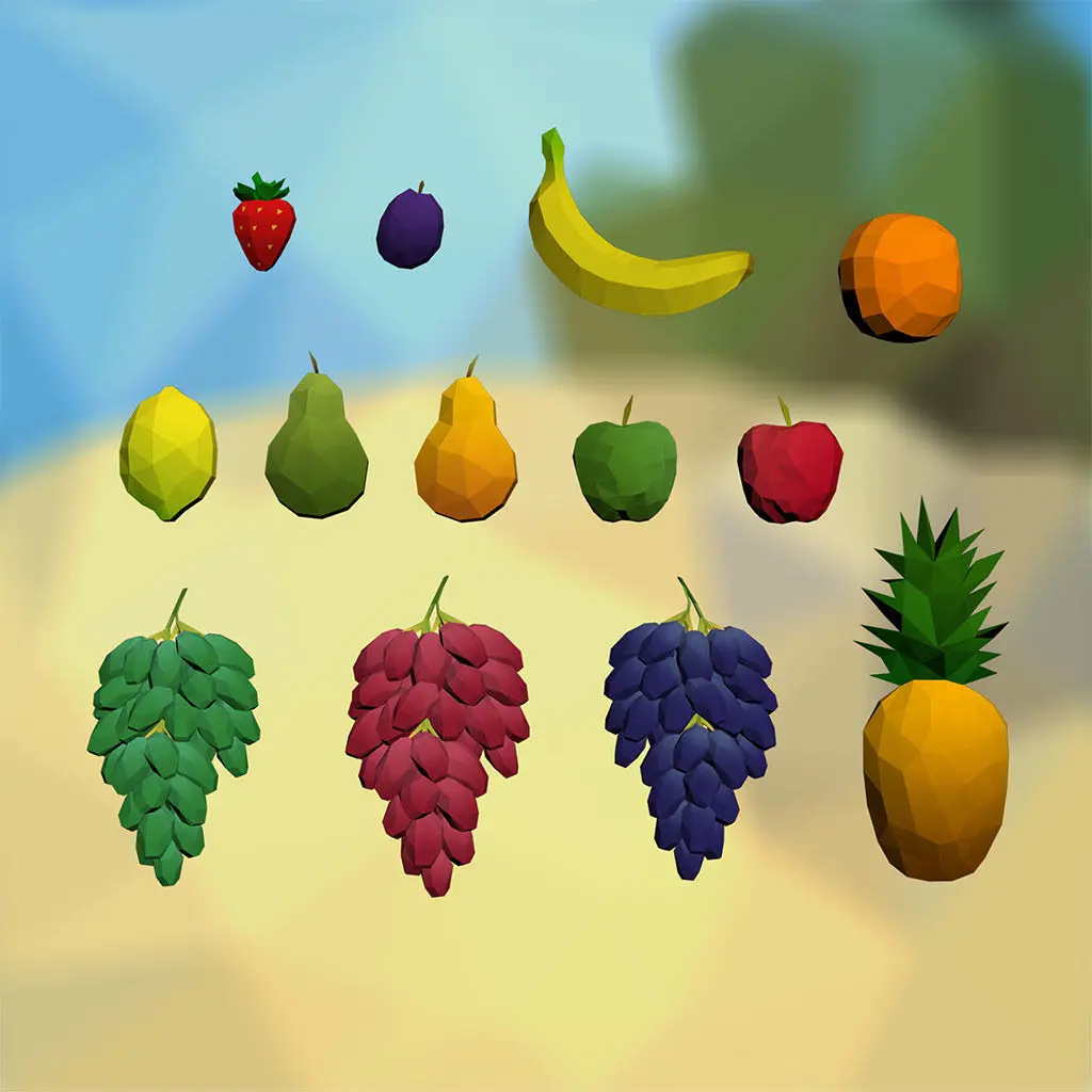 Fruits and Parrots is a low poly assets package with 49 unique assets:
