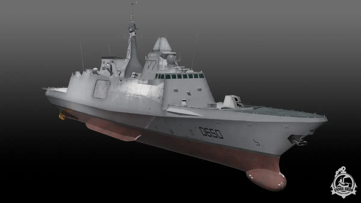 French navy modern warship FREMM class frigate FS Aquitaine high detail version. Modeled with blender 3.5, 210940 tris and 117306 vertices. Side dock and helicopter hanger are modeled. 46 textures used in square seize maximum 4k resolution. PBR material. The model is game ready. Overlapped uvs are only for some repeated objects. The texture pack is separately to be download.