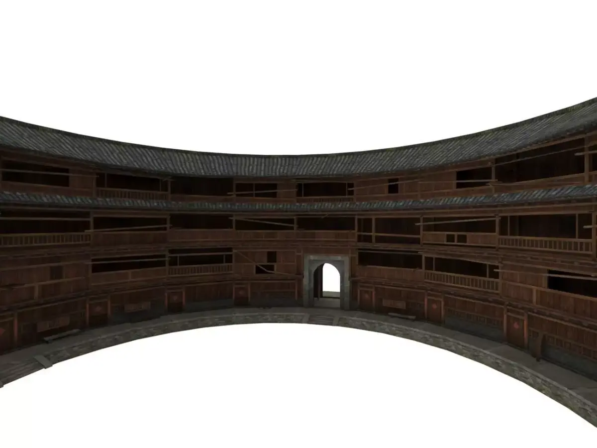 This is a highly detailed 3D model of Fujian Tulou, the traditional fortified communal residence of the Hakka people in Fujian, China, and a famous UNESCO World Cultural Heritage Site.Tulou is a unique ancient architectural wonder, built with rammed earth, wood, stone and tiles, famous for its large round or square shape, strong defensive structure and family‑shared living layout. The model faithfully reproduces its classic circular shape, thick earthen walls, wooden interior structure, central courtyard and traditional architectural details.