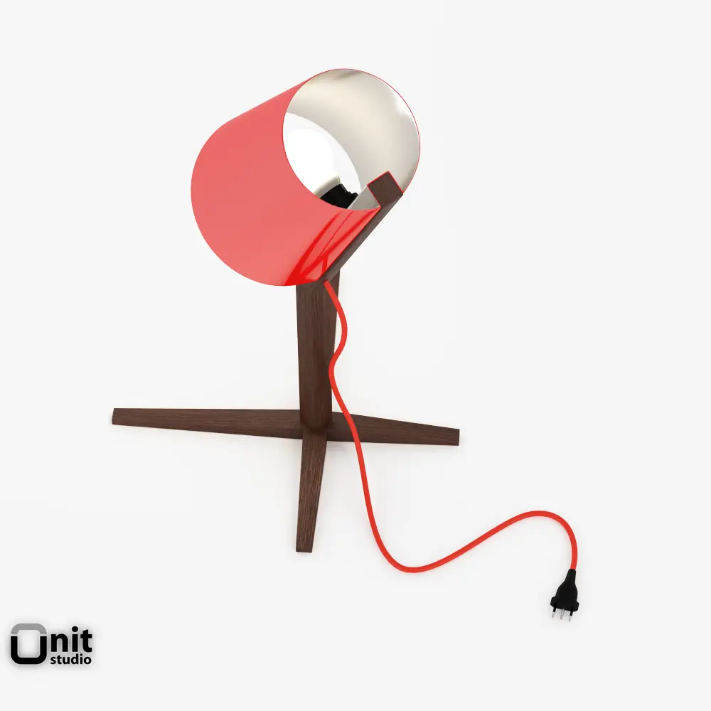 A fun new light angle from designer Sean Dare. Solid white oak post slants the view askew topped by tapered white shade. Off-center perspective is grounded in asymmetrical X base of intersecting focal points. Unexpected red cloth cord pops the light bright.