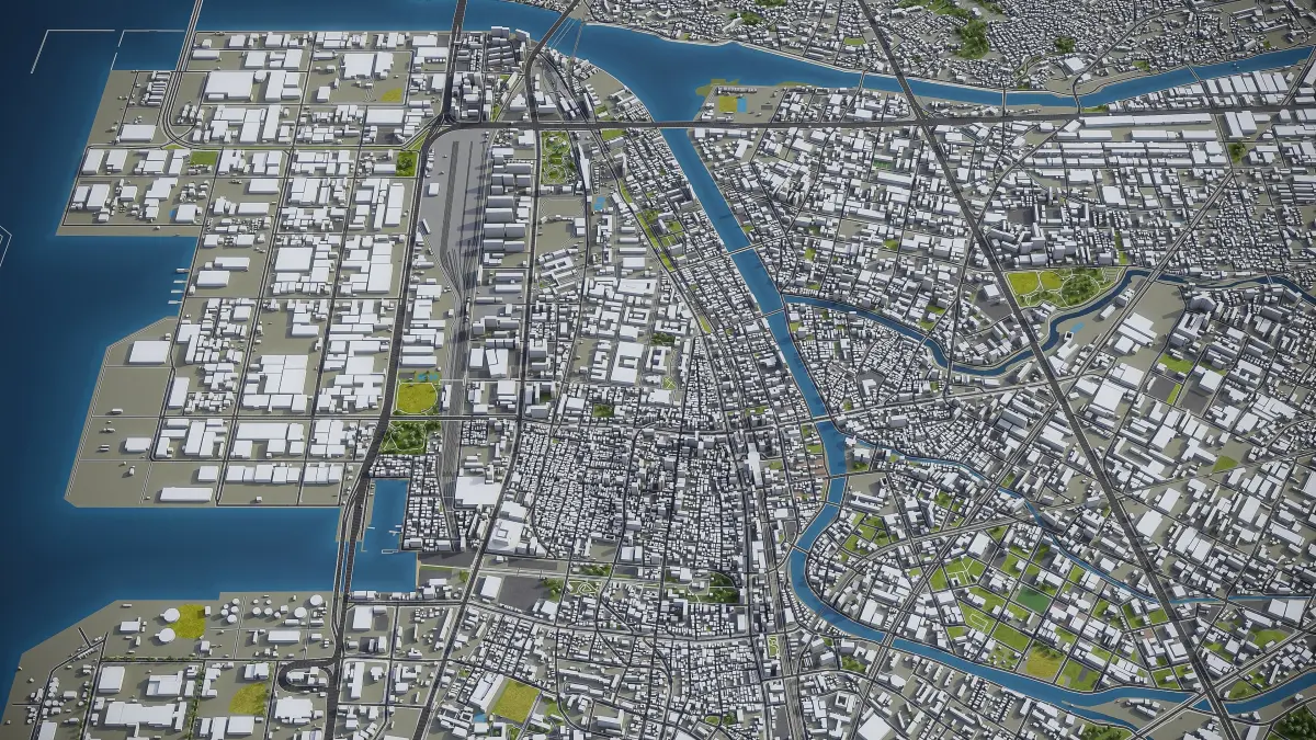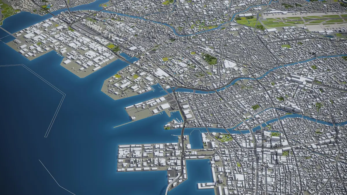 This is exact and accurate to scale 3D city model of Fukuoka - Kitakyushu Greater Metropolitan Region based on GIS data (December 2020)