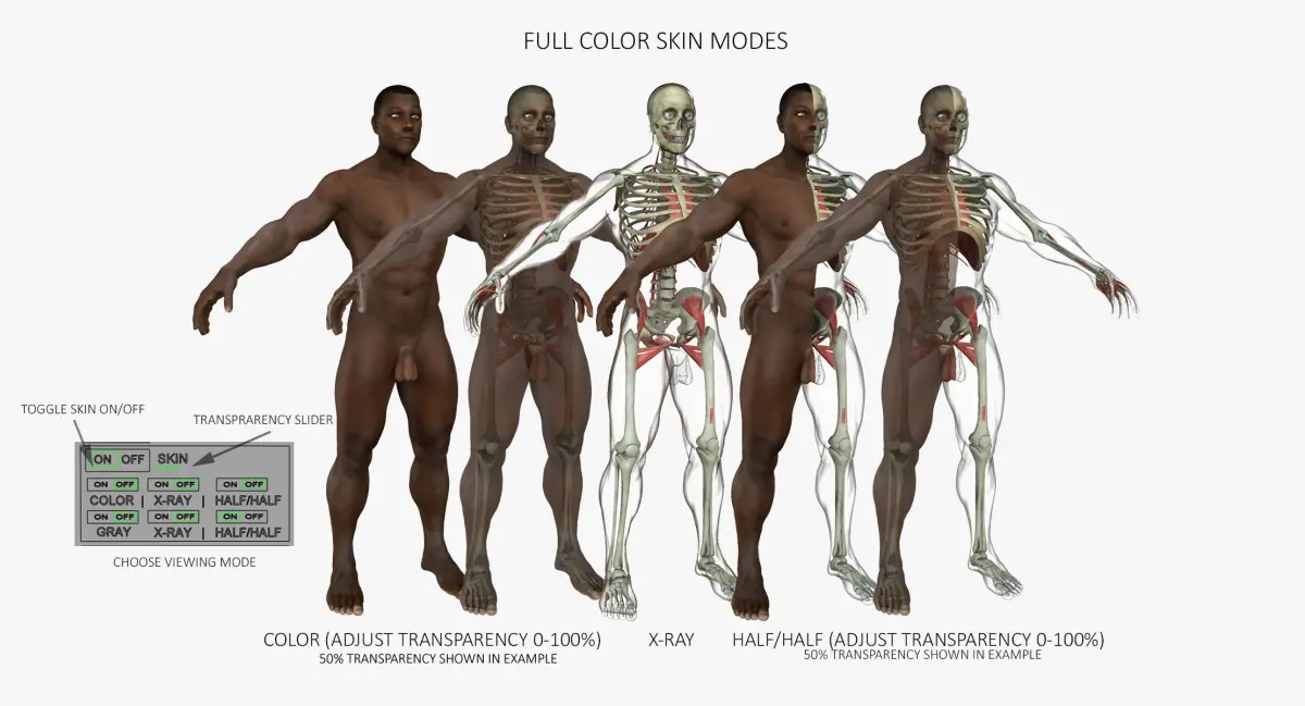 ==RIGGING*==-Transparency sliders allow custom levels of transparency per system.-All systems can be toggle on or off.-Can Isolate any muscle, including deep tissue muscle and see the correct origin and insertion onto the underlying skeleton-Several x-Ray Body shaders can be toggled on or off to see how the skin is positioned over the muscles and bones.-Built-in control sliders allow for model to be rotated 360 degrees without disrupting lighting.*Please note that the character itself is not rigged, only the advanced controls to view and isolate the systems and their transparency.