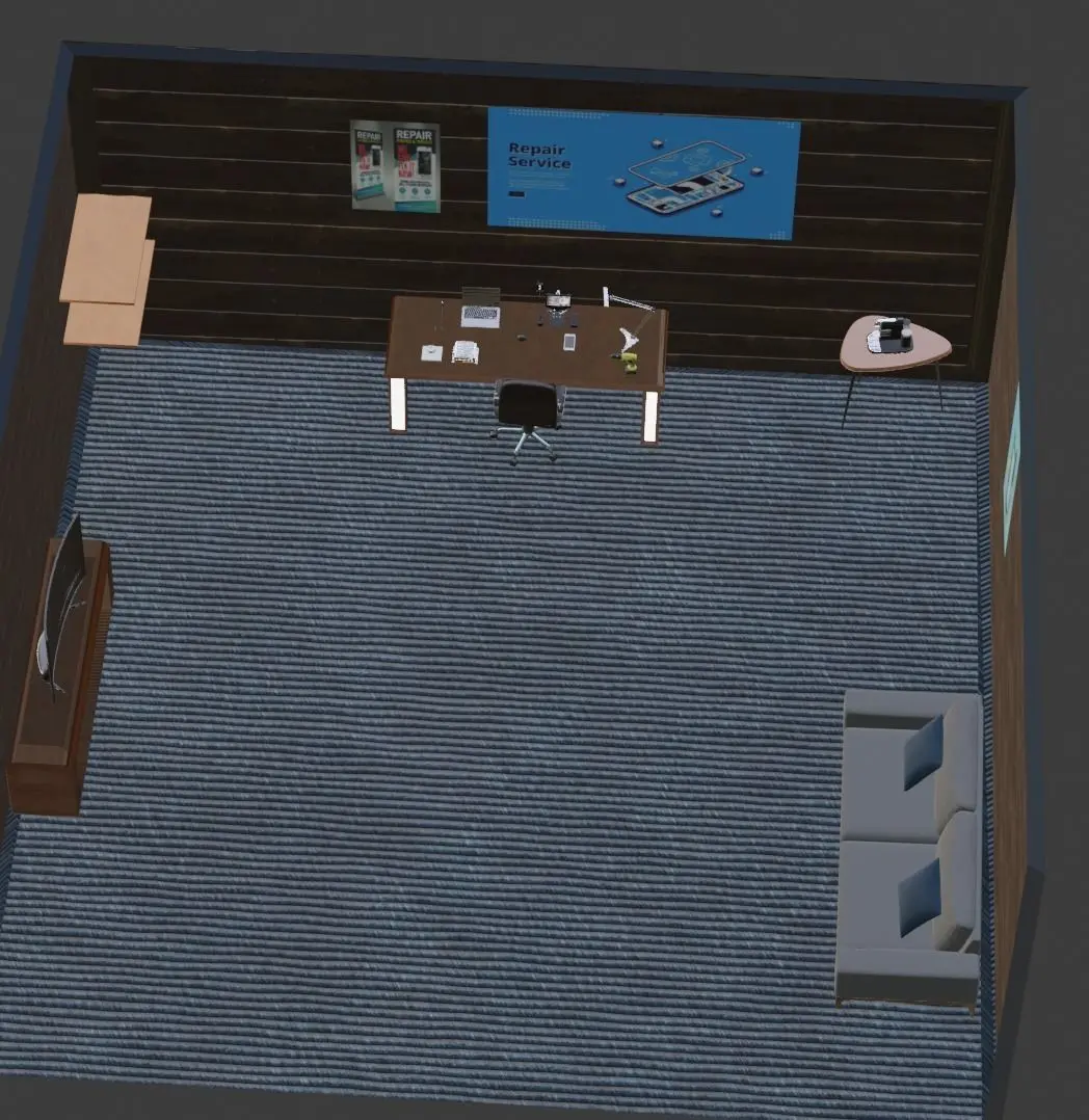 This my new office room designits a fully equipped office ( workshop ) for fixing phones scene,the room consists of highly detailed PBR textures ranges between 2k & 8k in PNG format.also, the room objects are organized in collections for easy navigation.the objects are :-workstation table with LED legs-office chair-shelves-tv table-3 posters