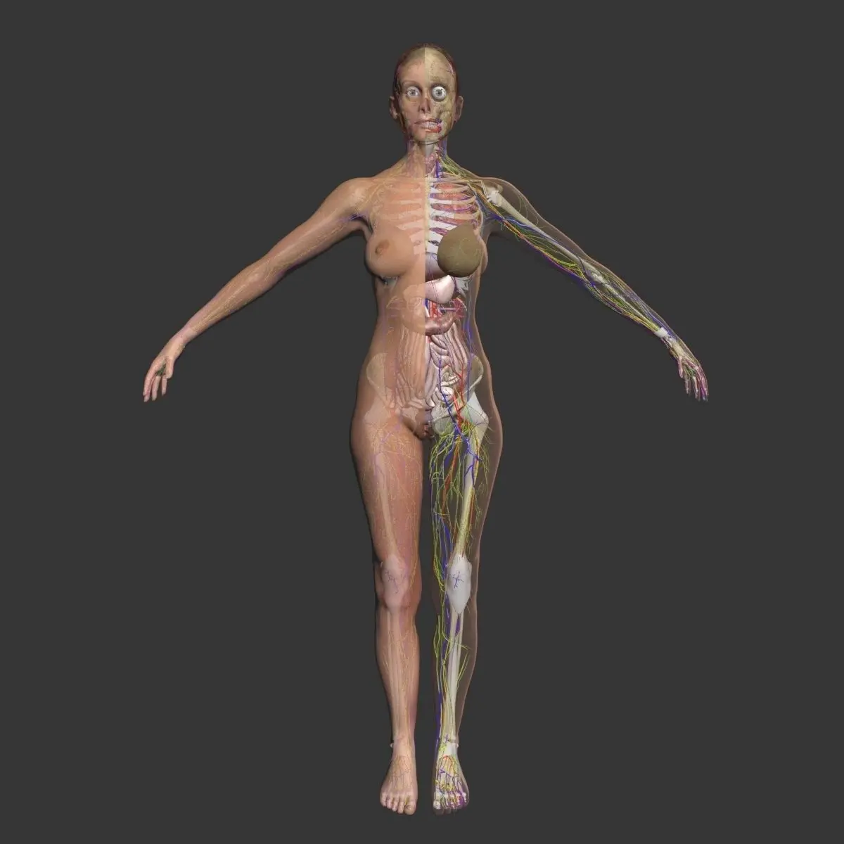 The Female Full Body Anatomy includes full body skeletal system with connective tissue, circulatory system, nervous system, lymphatic system, digestive system, respiratory system, and urogenital system. OBJ file is also included for maximum compatibility.