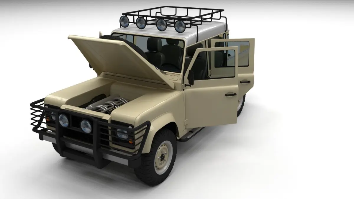A very accurate model of a Land Rover Defender 110 Double Cab Pick Up with a HIGHLY DETAILED INTERIOR AND CHASSIS, WITH ENGINE, GEARBOX, EXHAUST, SUSPENSION AND BRAKES MODELED.