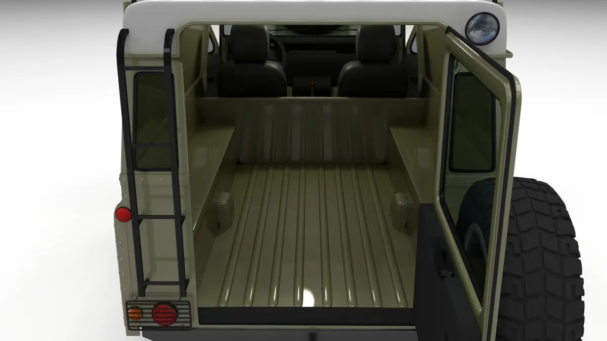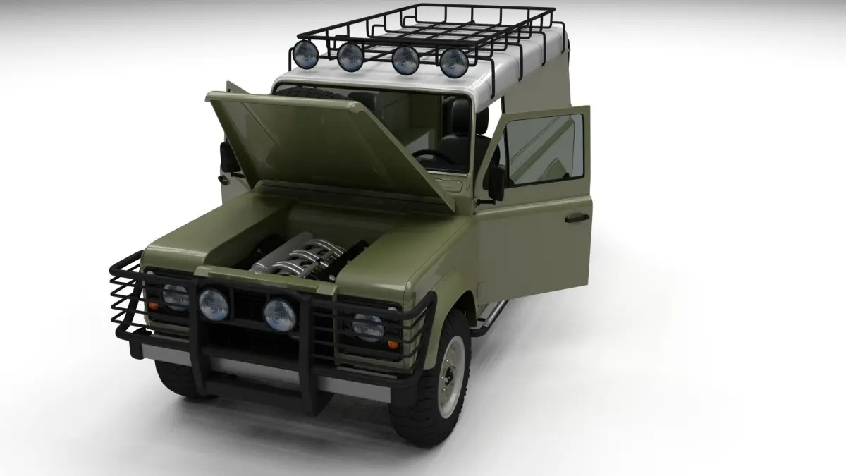 A very accurate model of a Land Rover Defender 110 Hard Top with a HIGHLY DETAILED INTERIOR AND CHASSIS, WITH ENGINE, GEARBOX, EXHAUST, SUSPENSION AND BRAKES MODELED.