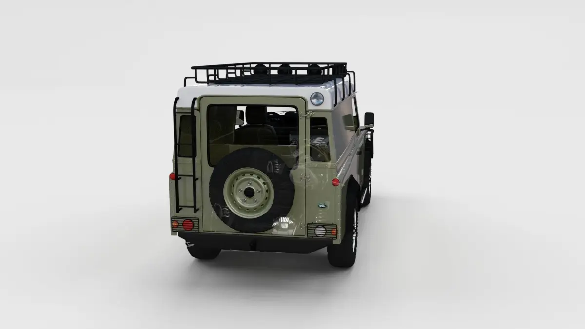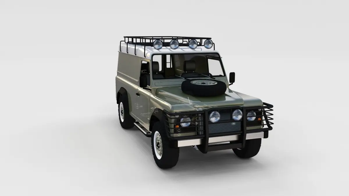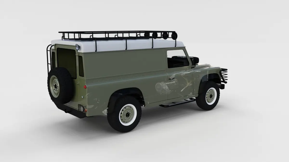 A very accurate model of a Land Rover Defender 110 Hard Top with a HIGHLY DETAILED INTERIOR AND CHASSIS, WITH ENGINE, GEARBOX, EXHAUST, SUSPENSION AND BRAKES MODELED.