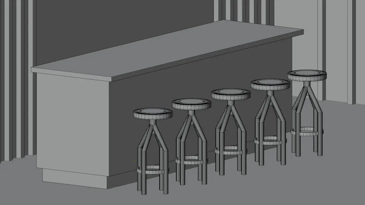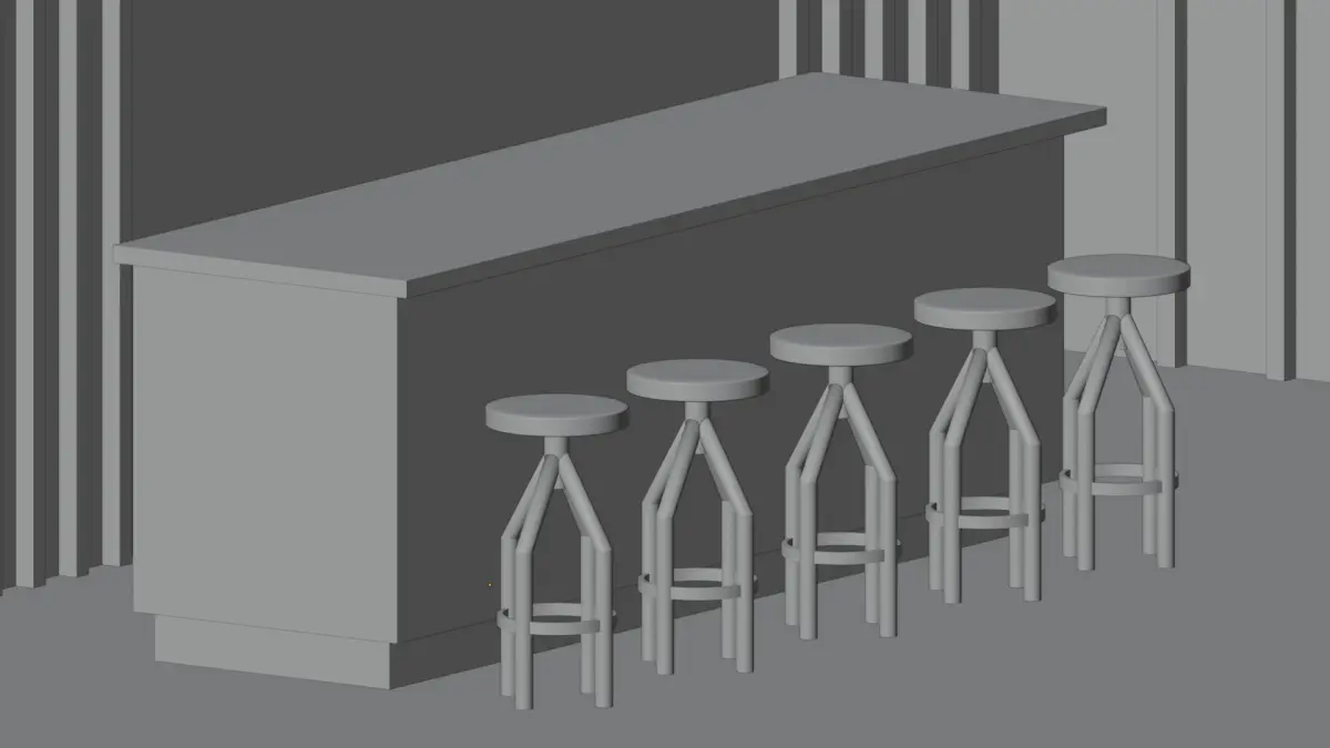 Pre-arranged full scene with counter table, 4 stools, background props (wall, window frame, lamp, floor plane) – ideal for rendering or animation previews.