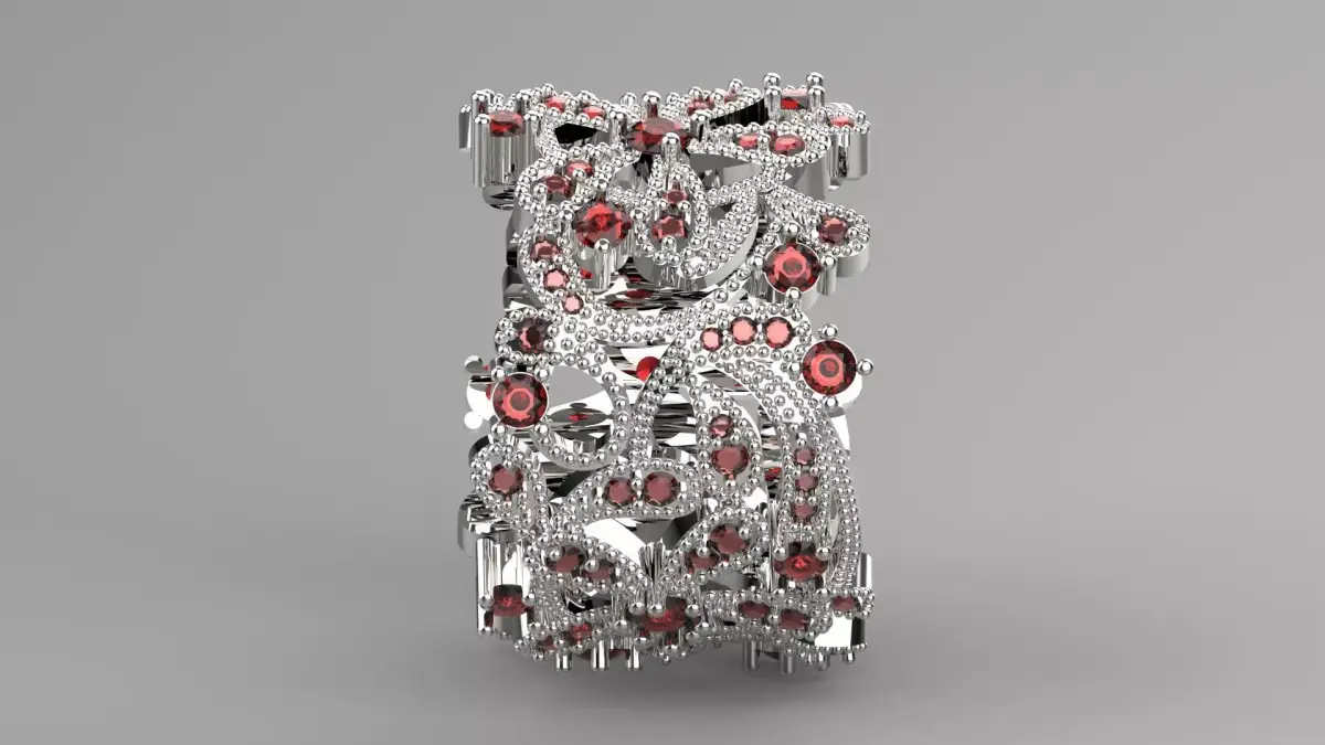 This CAD file is designed to create a very wide and voluminous ring, the outer surface of which is completely covered with plant designs (flower or branch motifs) and an unprecedented density of small stones.