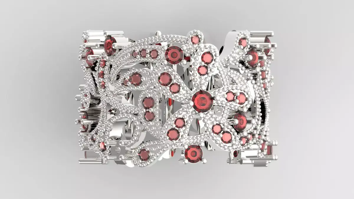 | Feature | Details || :--- | :--- || Ring Type | Super Wide Full-Eternity Band || Design Style | Dense scrollwork and floral textures, vintage or Edwardian || Suggested Metal | 18k white gold or platinum (due to the need for strength to hold so many stones) || Stones Used | Round Gemstones (Diamonds or Ruby) || Distinguishing Feature | Extremely high density and 3D Texture in the gem setting |
