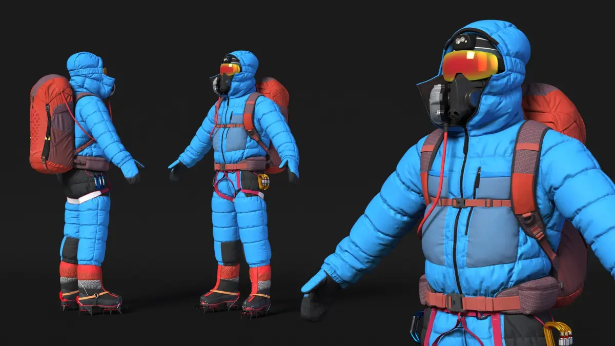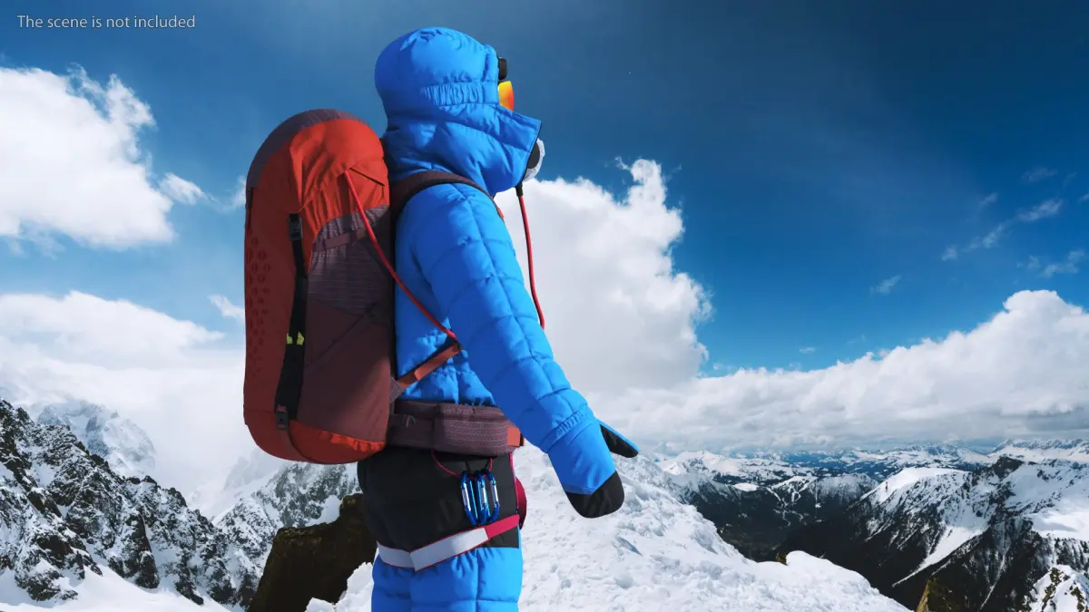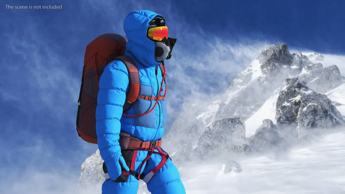 Fully Equipped High Altitude Climber Blue Rigged for Cinema 4D is a three-dimensional model of brave mountaineer athlete with an advanced mountaineering attire and gear, specifically designed for high-altitude expeditions and extreme cold conditions.