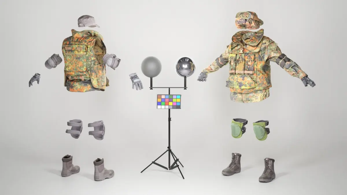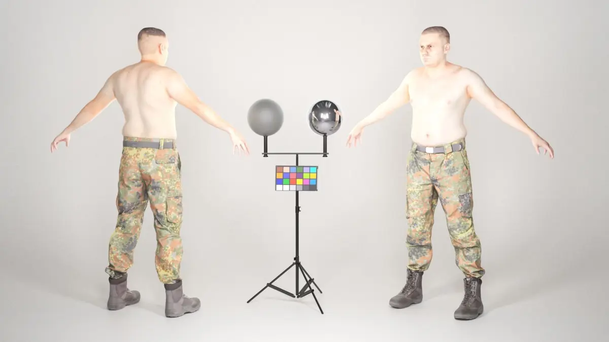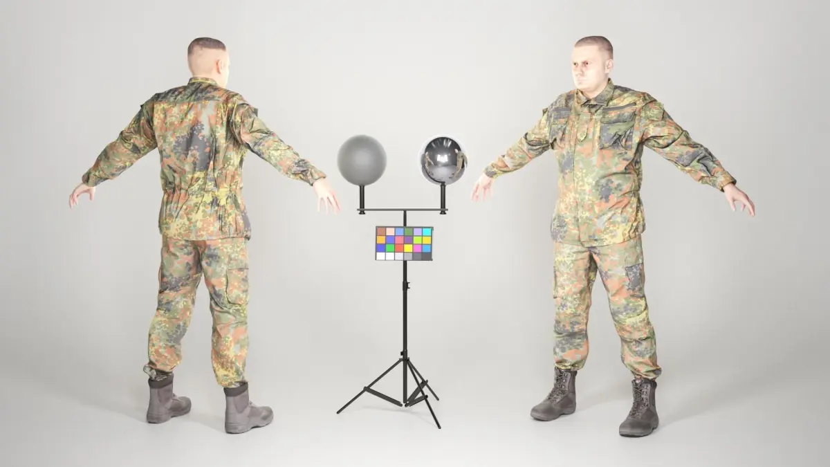 This is a true human size detailed model of a brave soldier dressed in a Bundeswehr uniform, in full body armor, with lost of props, which can be separated any used individually. All models have PBR textures. The soldier is captured in the A-pose with mesh ready for rigging and animation in all most usable 3d software.
