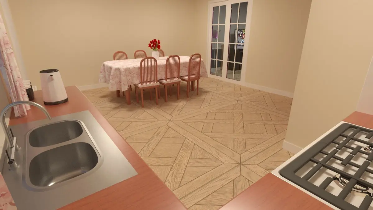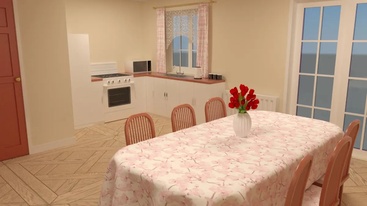 A fully furnished detached house with connected garage. This model is a highly detailed home with a large living room and kitchen, two large bedrooms and two smaller bedrooms.A full up stairs bathroom and smaller toliet and wash basin room on the ground floor.The living room is connected to the kitchen with double sliding doors with a second set of sliding doors leading out the kitchen to the back of the house.Each room is fully decorated with a differant look in each room and all fullly furnished through out with sofas,coffee table,tv unit with tv,speakers,fitted kitchen,microwave,fridge freezer,washing machine and dish washer.The bedrooms are fitted with double or sindle beds fitted wardrobes in the larger rooms and free standing wardrobes and chest of draws in the smaller bedrooms.The bedrooms have some smaller details to make then look more lived in such as a laptop, alexa show 5,books,bedside lamps and family photos.