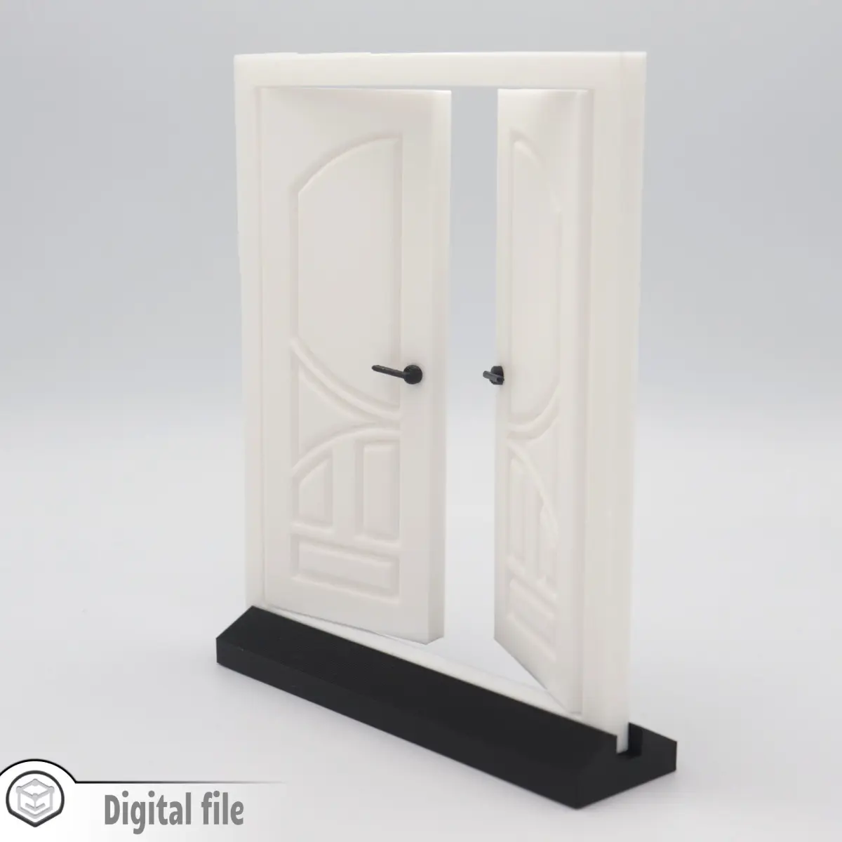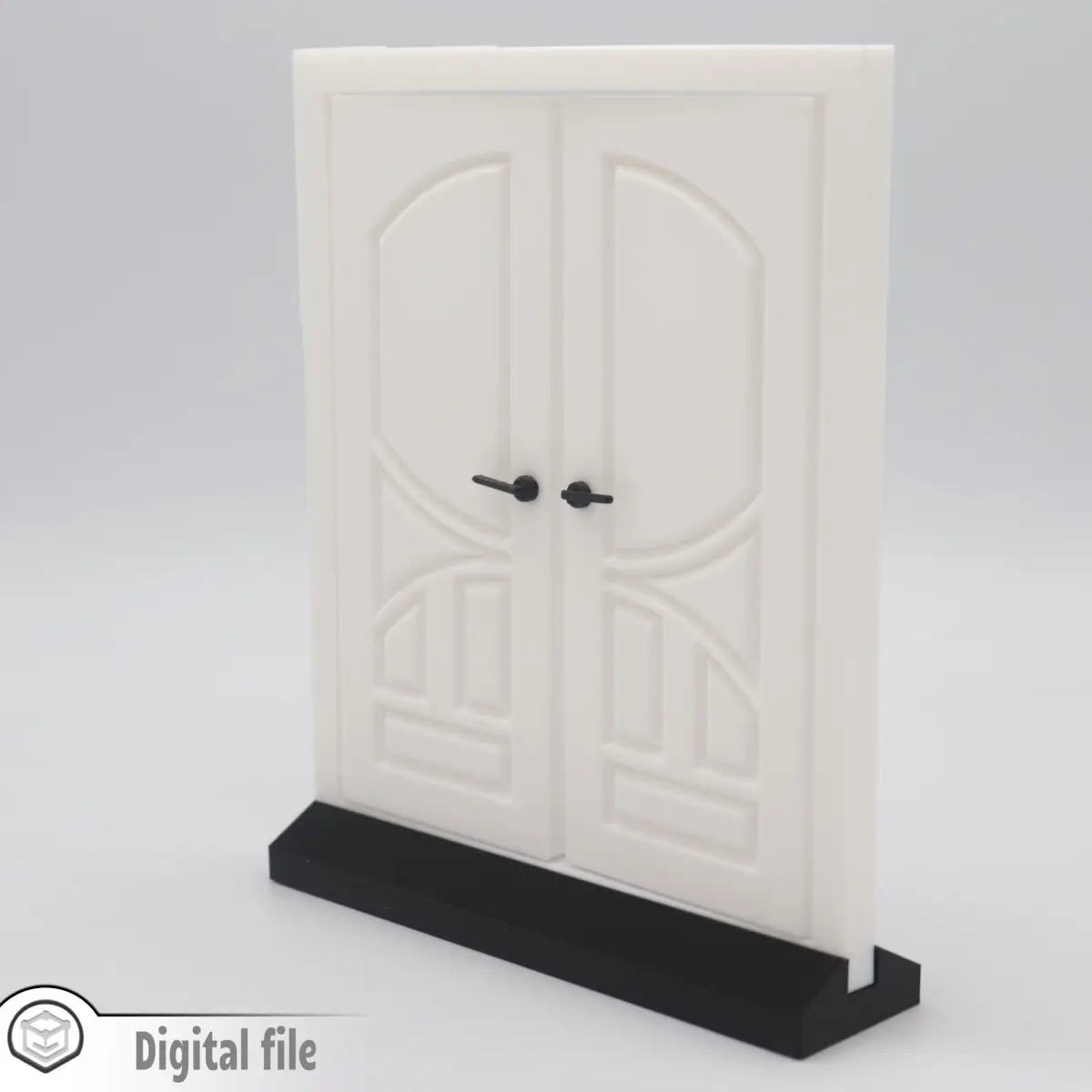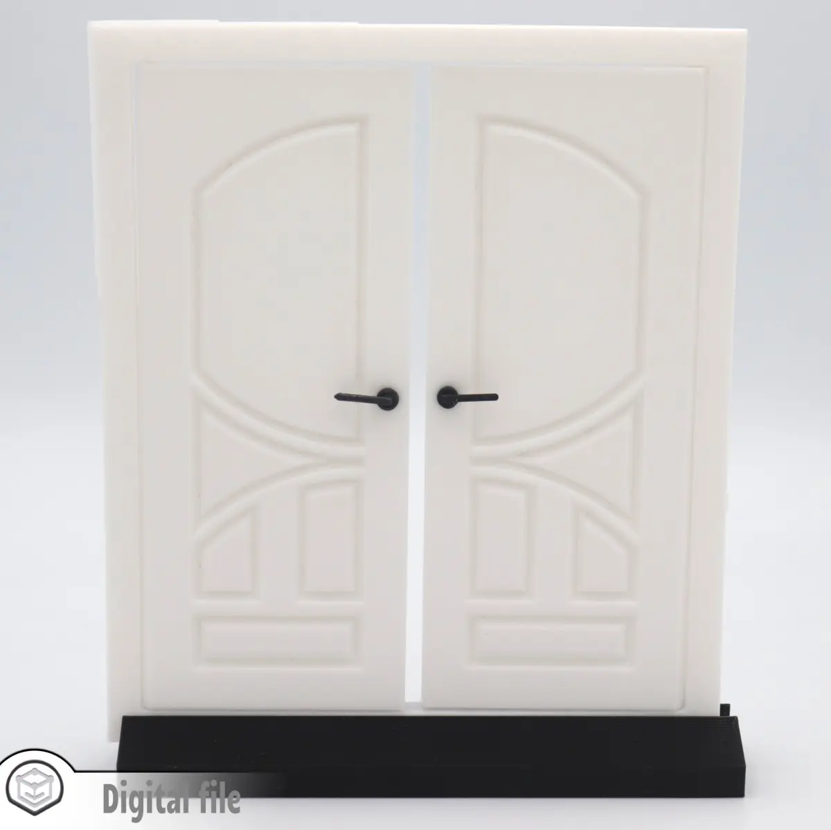 The overall dimensions are 165X144X8.9 mm. If you would like other dimensions or the model thicken at a certain measurement, please send us a message. We know that every dollhouse has it's particularity.The door will pivot 180 degree and you can print the handles separately and fix them with glue. The back panel is extruded 4 mm, so you can attach it to your dollhouse wall.You will receive in the zip file: