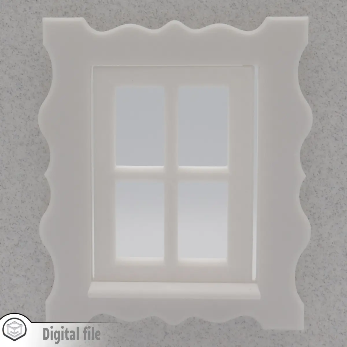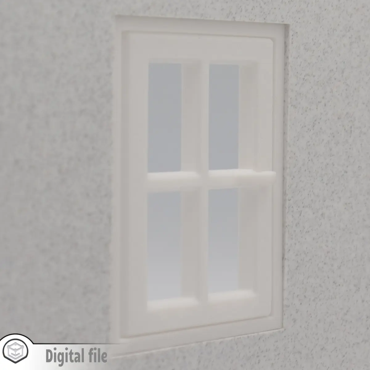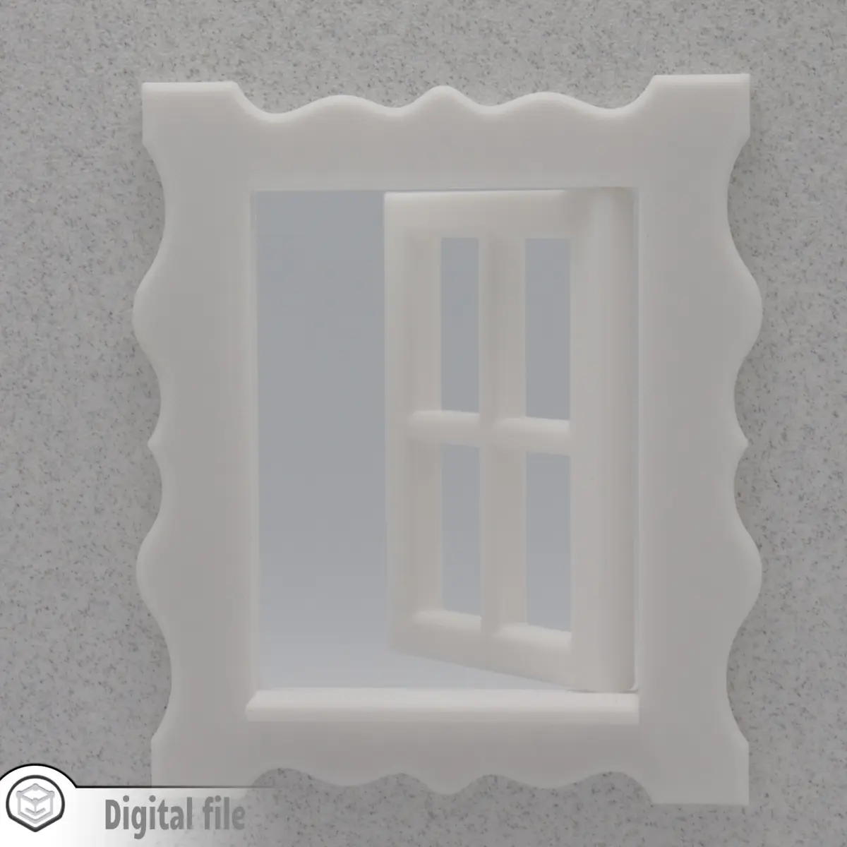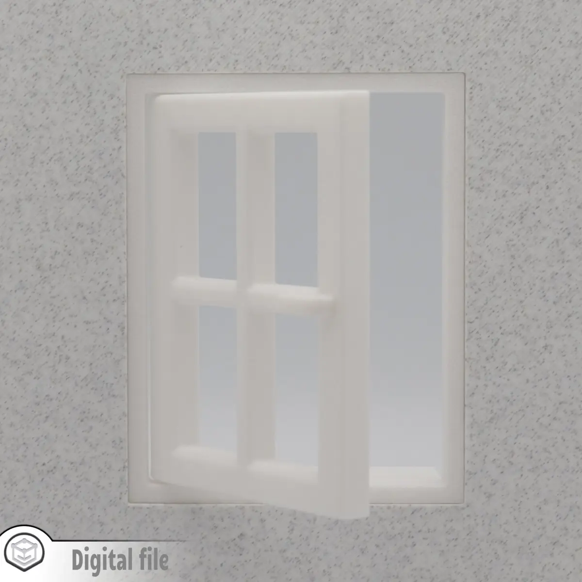 The overall dimensions are 120X104X20 mm. If you would like other dimensions or the model thicken at a certain measurement, please send us a message. We know that every dollhouse has it's particularity.The window will pivot 180 degree. The back panel is extruded 4 mm, so you can attach it to your dollhouse wall.You will receive in the zip file: