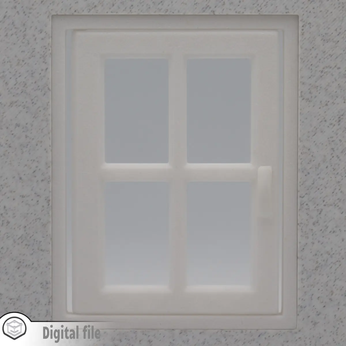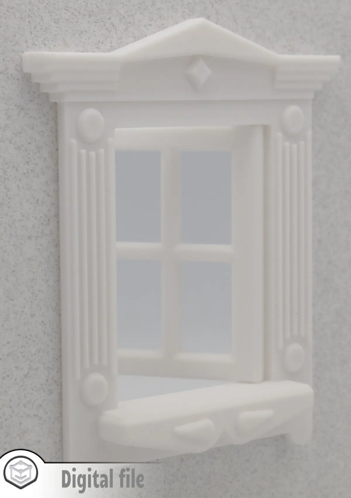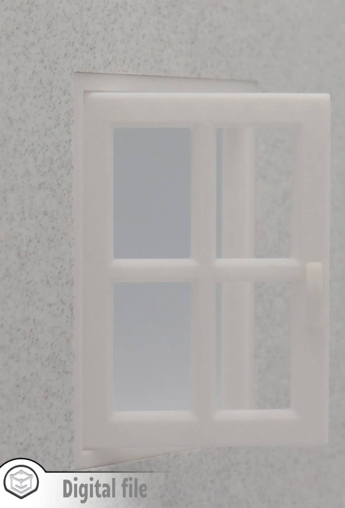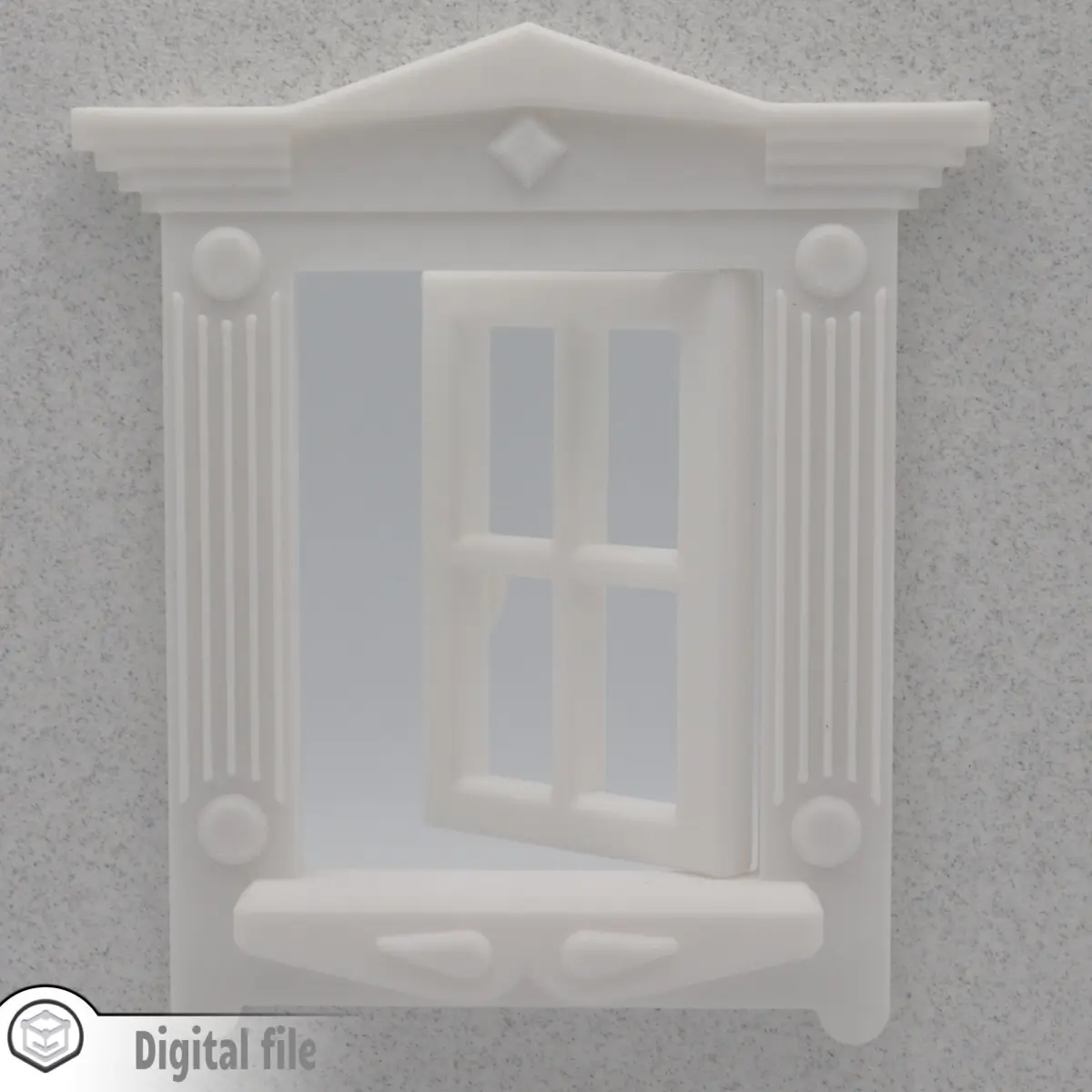 The overall dimensions are 140X124X22 mm. If you would like other dimensions or the model thicken at a certain measurement, please send us a message. We know that every dollhouse has it's particularity.The window will pivot 180 degree. The back panel is extruded 4 mm, so you can attach it to your dollhouse wall.You will receive in the zip file: