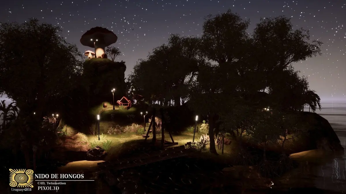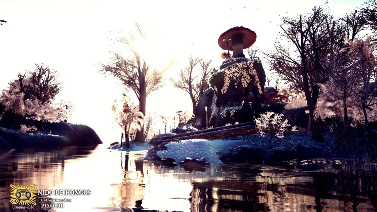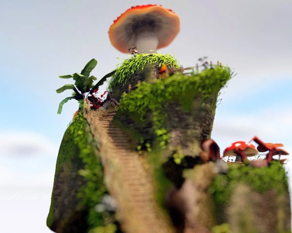 Fungus Nest, is a fantasy scene, where a three-level structure is erected. The place is a mound populated by inhabited mushrooms, flowers and plants.The scene contains animations of insects and birds, etc