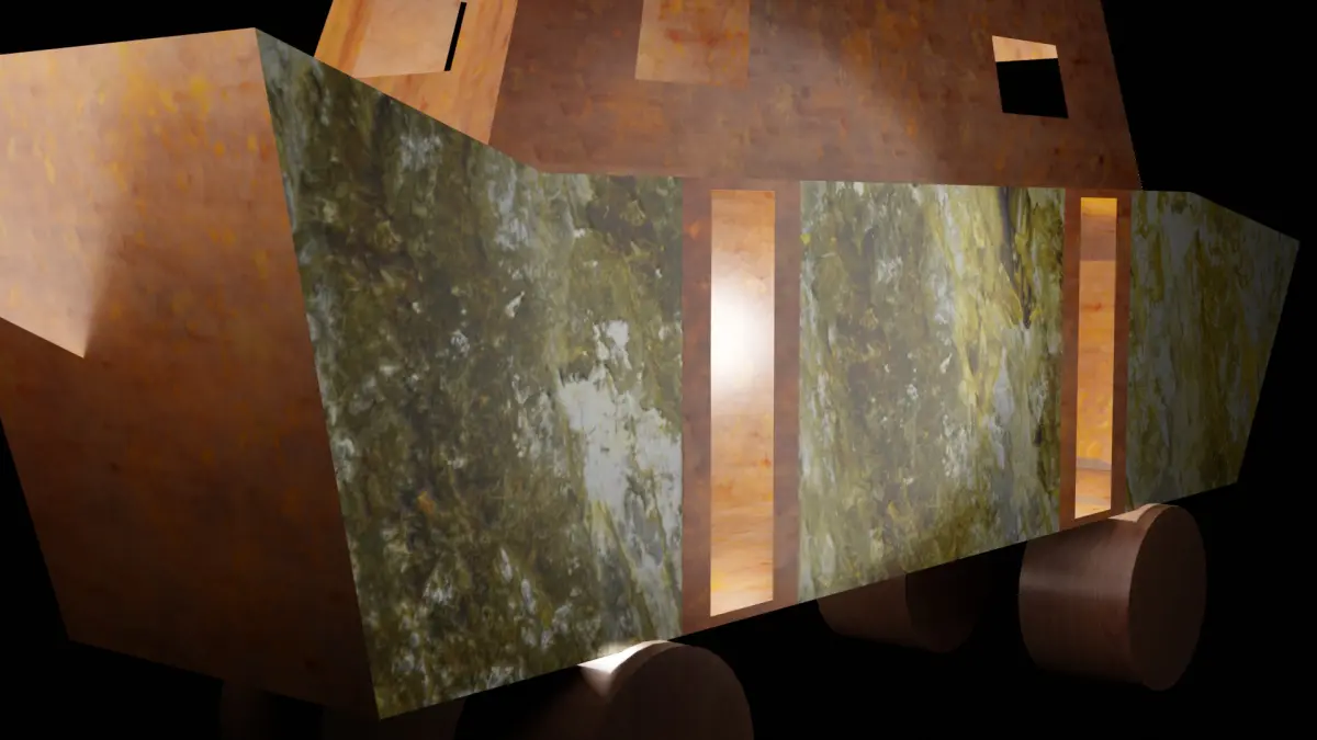 Car was made by modifying default object, no modifier in Blender or other plugins. Images textures were modified by GIMP. Model looks funny and light enough for any purpose of using. Render engine: Eevee.