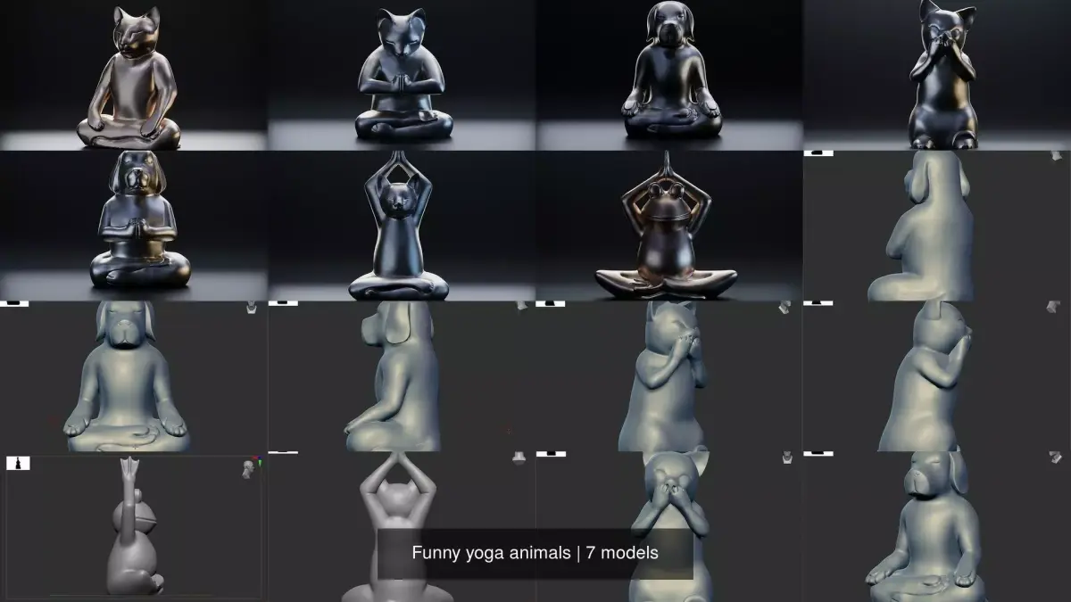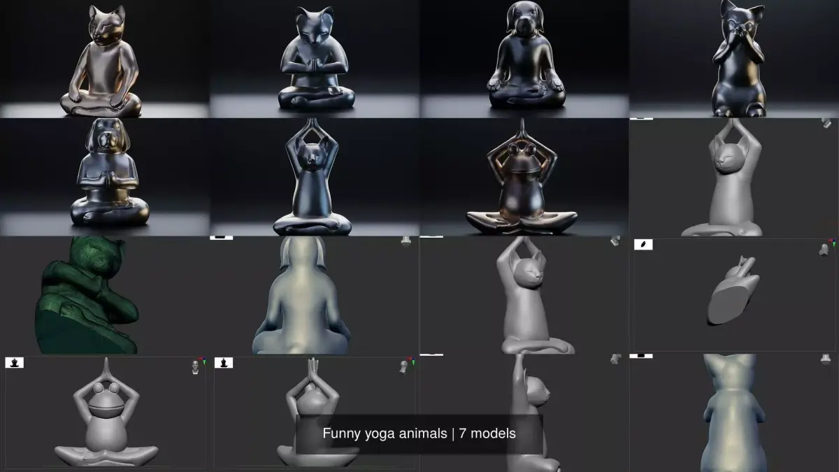 All 3d models for printing in the form of animals in the form of yoga.For more information, you can look at the assets themselves, which are separate.The number of polygons per model is 150,000 - 250,000 triangles.The set includes 7 models.Saving $ 30)