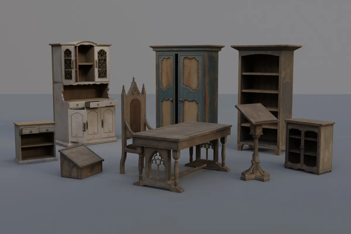 Bookcase small - 1198 facesBookcase 3 - 254 facesBookstand 1 - 904 facesBookstand 2 1063 facesCabinet 2 - 4389 faces Cabinet 3 - 450 facesThrone - 2198 facesTable 2 - 5002 facesWardrobe 2 - 3021faces