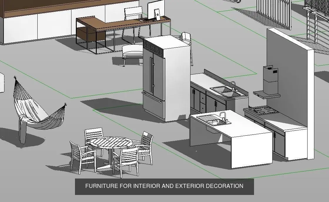 collection of furniture for interior and exterior design, in different formats for revit, autocad, blender, lumion, fbx for 3dmax, high-quality furniture for all types of design, native to rfa families. improve your projects with these excellent furniture