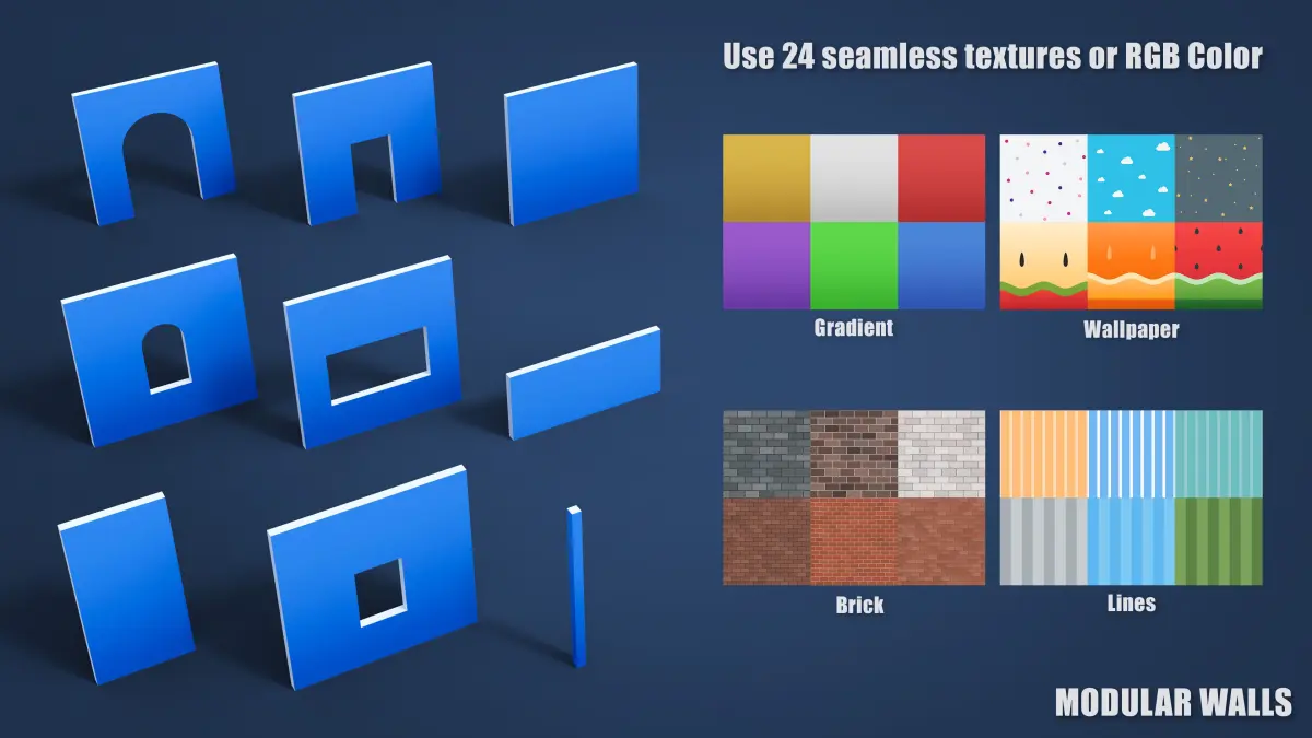 - 42 customizable textures. A wide selection of wall and floor textures, from solid RGB colors to beautiful patterns including gradients, wallpaper, brick, and tile. Perfect for adding variety and style to your environment.
