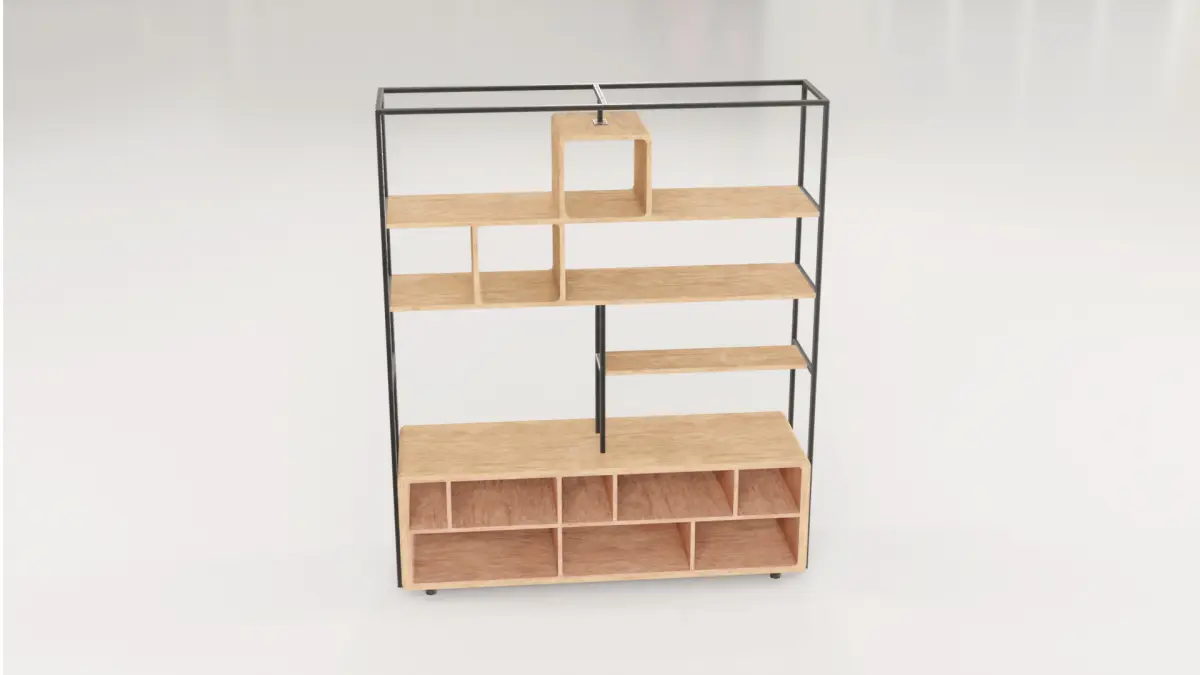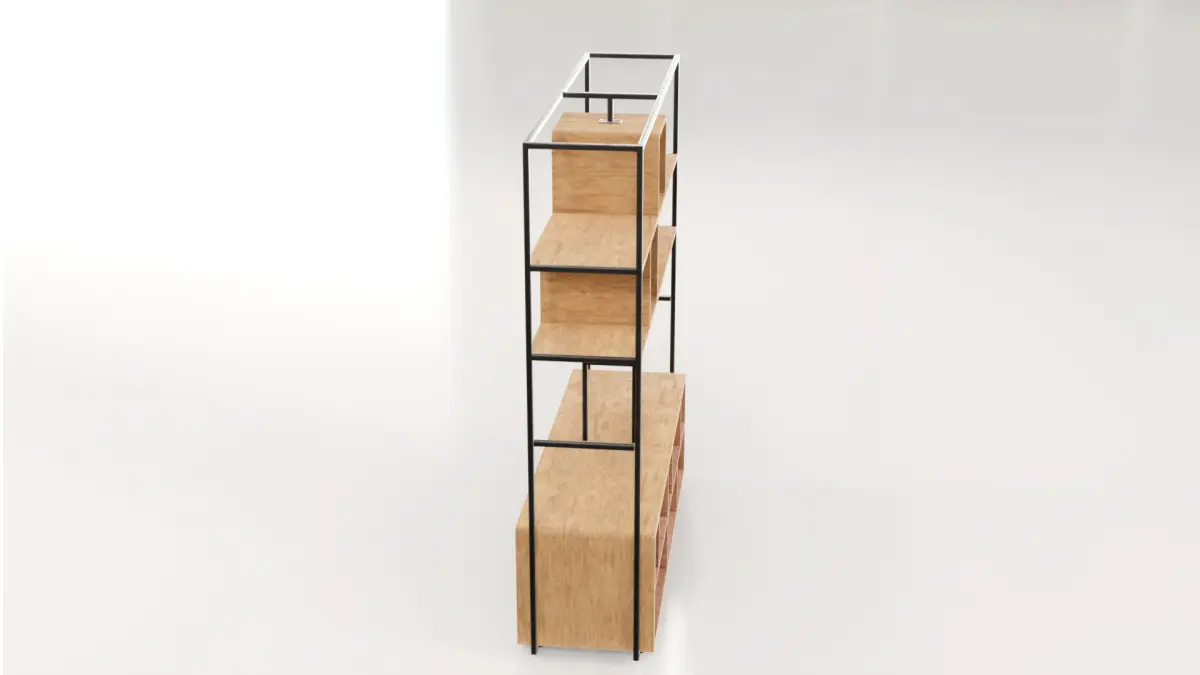 Modern and functional shelf, ideal for architectural visualization, interior design, and CGI. Its structure combines wood and metal, offering an industrial and elegant design. Features detailed PBR textures for a realistic finish under any lighting. Compatible with render engines and video games, optimized for efficient performance. Perfect for complementing modern, commercial, or minimalist spaces.