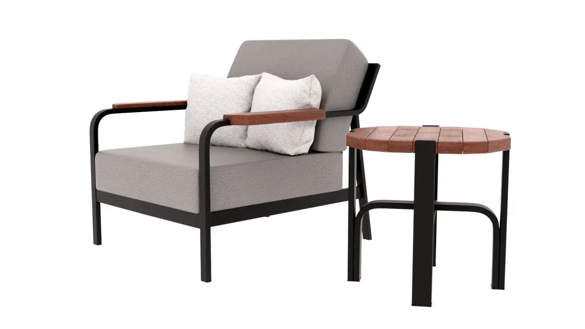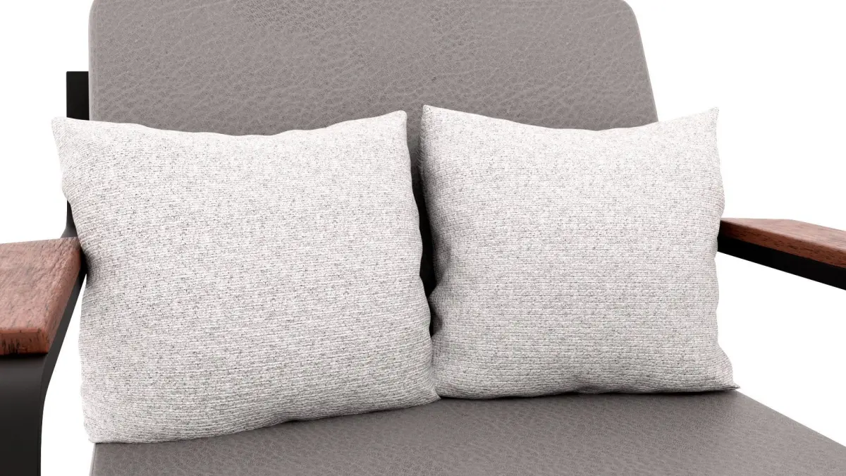 Lounge set, leather sofa with decorative pillows and loft-style coffee table for relaxation.