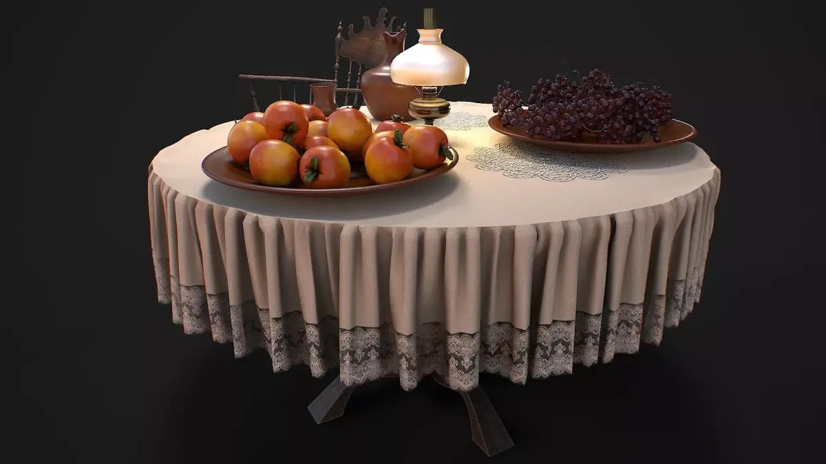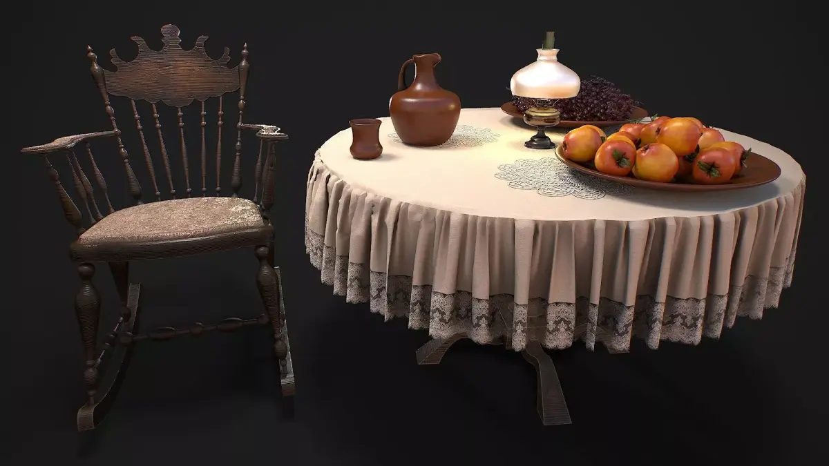 Hello. This is a high definition quality polygon of a Furniture set with dishes and fruits 3D Model with PBR textures. Extremely detailed and realistic. Suitable for movie prop, architectural visualizations, advertising renders, games, VR, AR and other. The archive includes Obj and FBX, Marmoset scene, Blender scene, textures for the PBR: Base color, Metallic, Mixed AO, Normal_OpenGL, Roughness. And also included in the archive textures for UE: BaseColor, Normal, OcclusionRoughnessMetallic. All textures are 4k resolution. The model contains 42 objects: apple-16, cup-1, doily-3, grape-15, jug-1, oil lamp-1, plate-2, rocking chair-1, table-1, tablecloth-1.