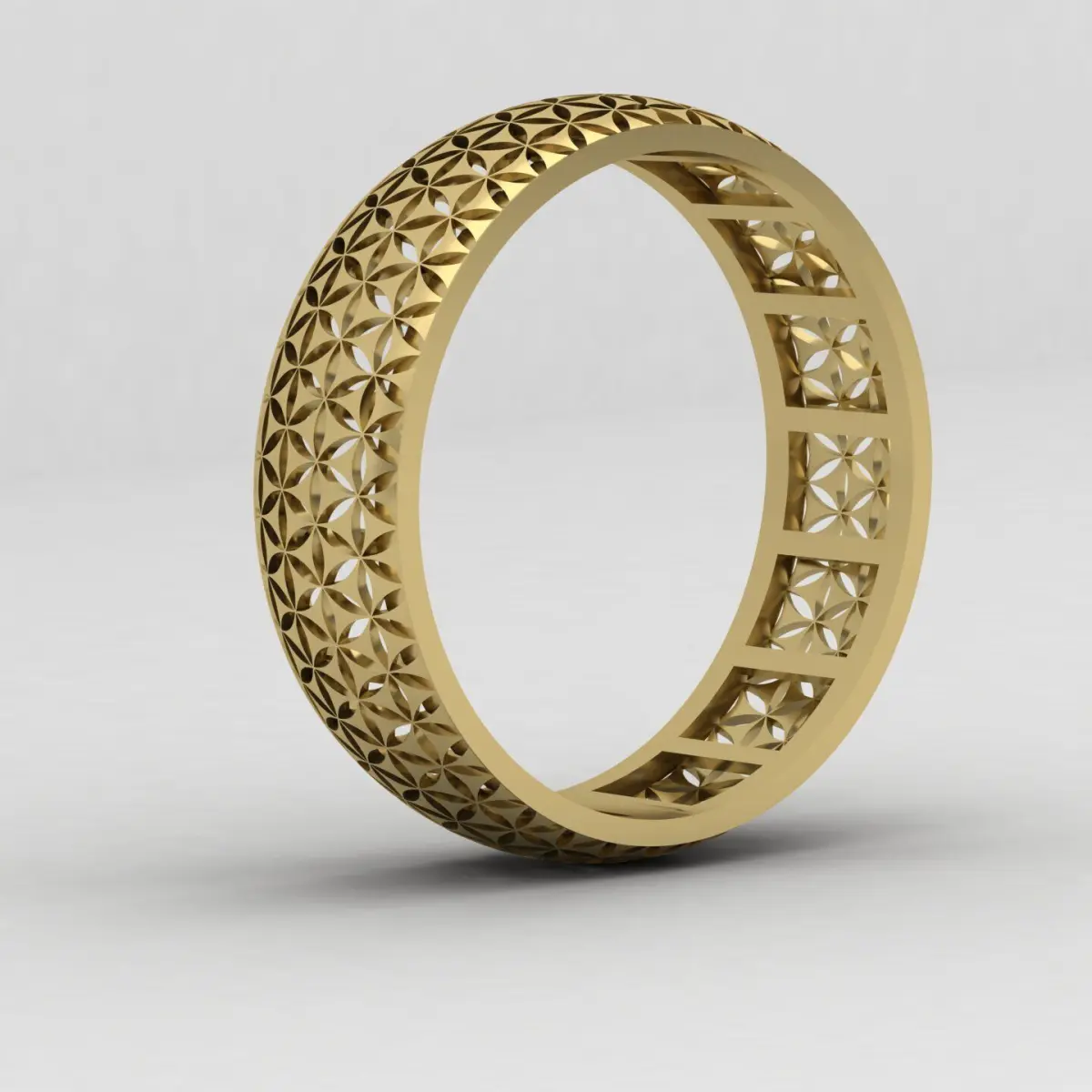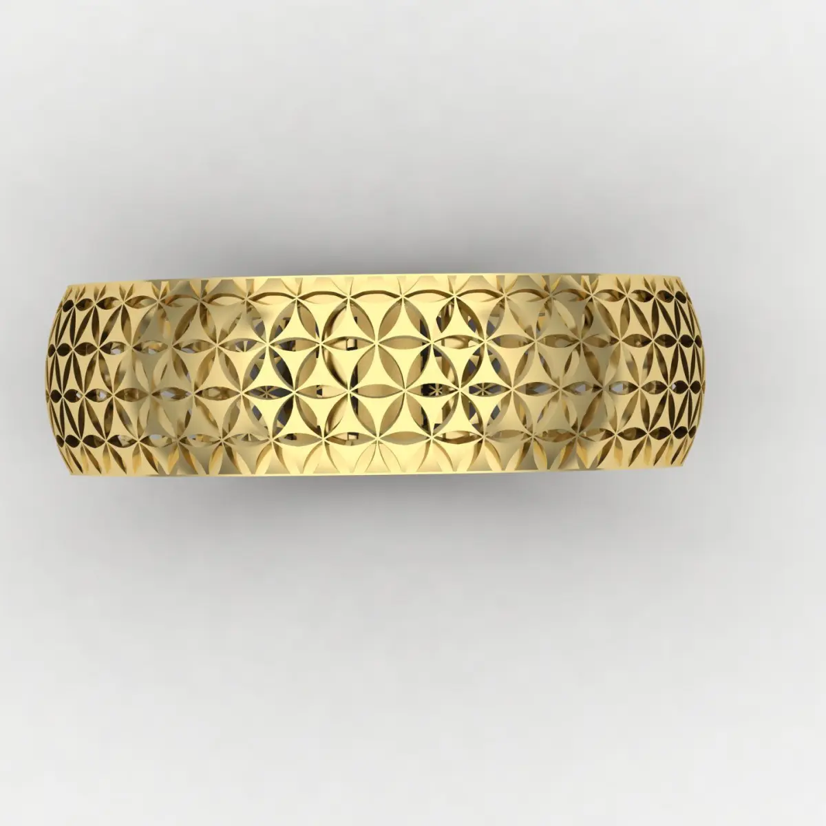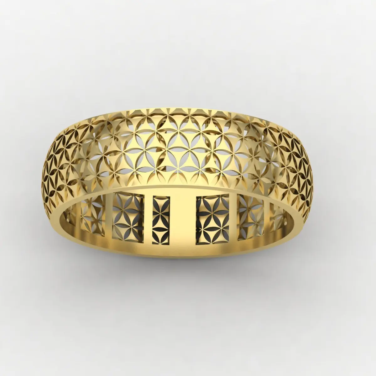 This elegant ring features a seamless geometric flower pattern (often referred to as the “Flower of Life”) engraved across the outer and inner surfaces of the band, giving it a unique and modern look from every angle. The design is fully perforated, making it ideal for 3D printing and jewelry casting.Ring Size: EU 55 (inner diameter approx. 17.5 mm)Band Width: ~6 mmWeight in 18k yellow gold : 2.26 gramsWall Thickness: ~400 microns (0.4 mm)Clean, ready-to-print topologyIdeal for wax/resin 3D printing and lost-wax castingSuitable for gold, silver, or other metal casting High-detail model for precision production