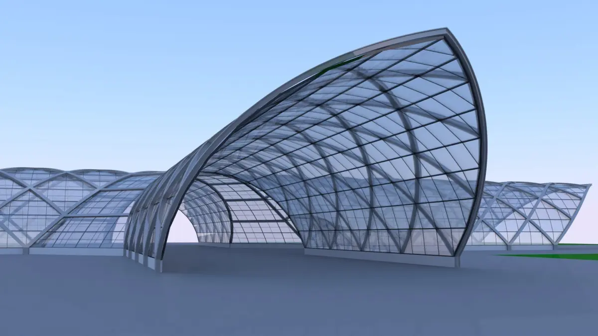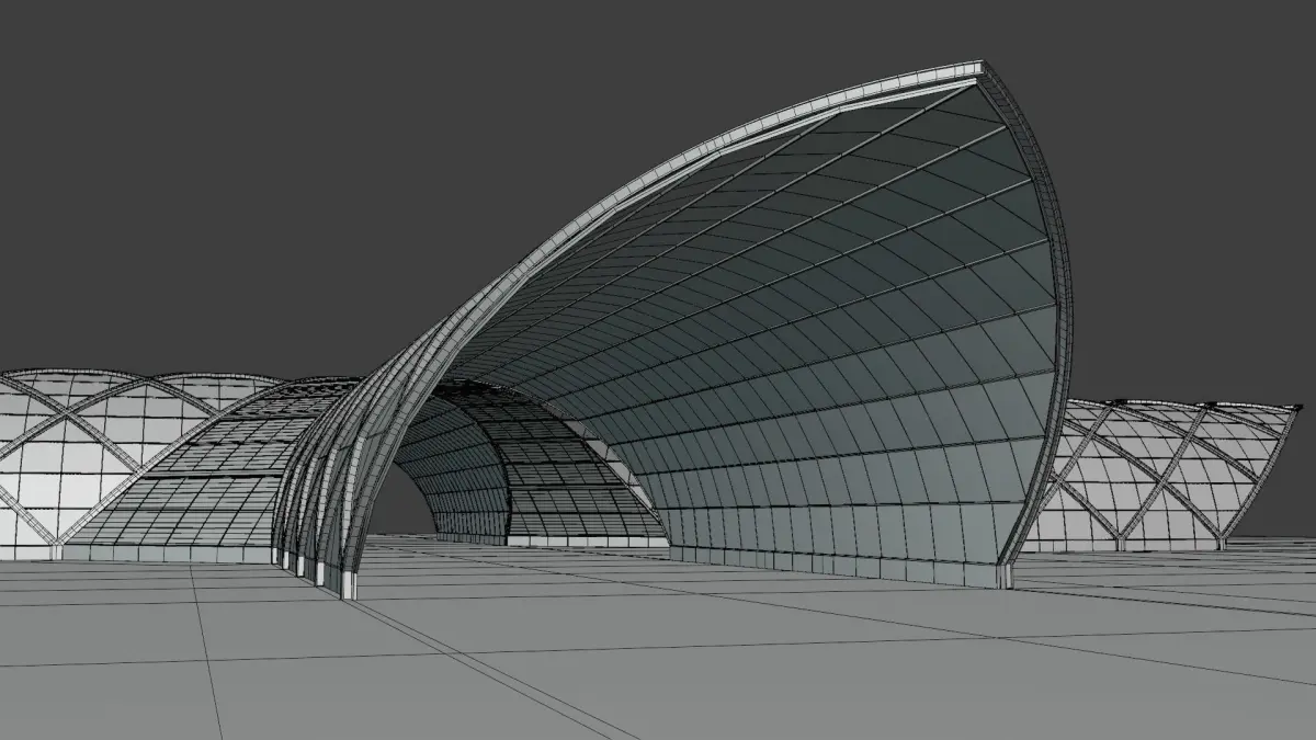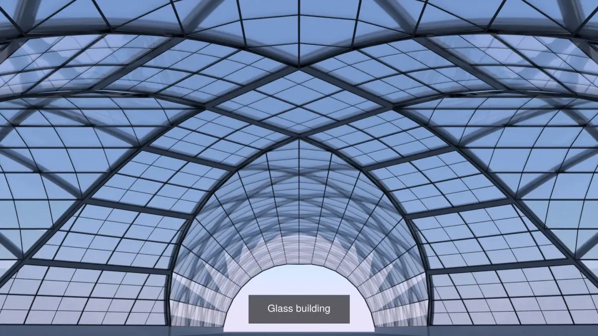 These are 3D models of futuristic and glass buildings.