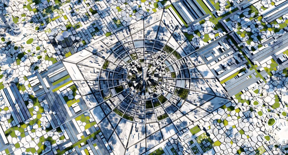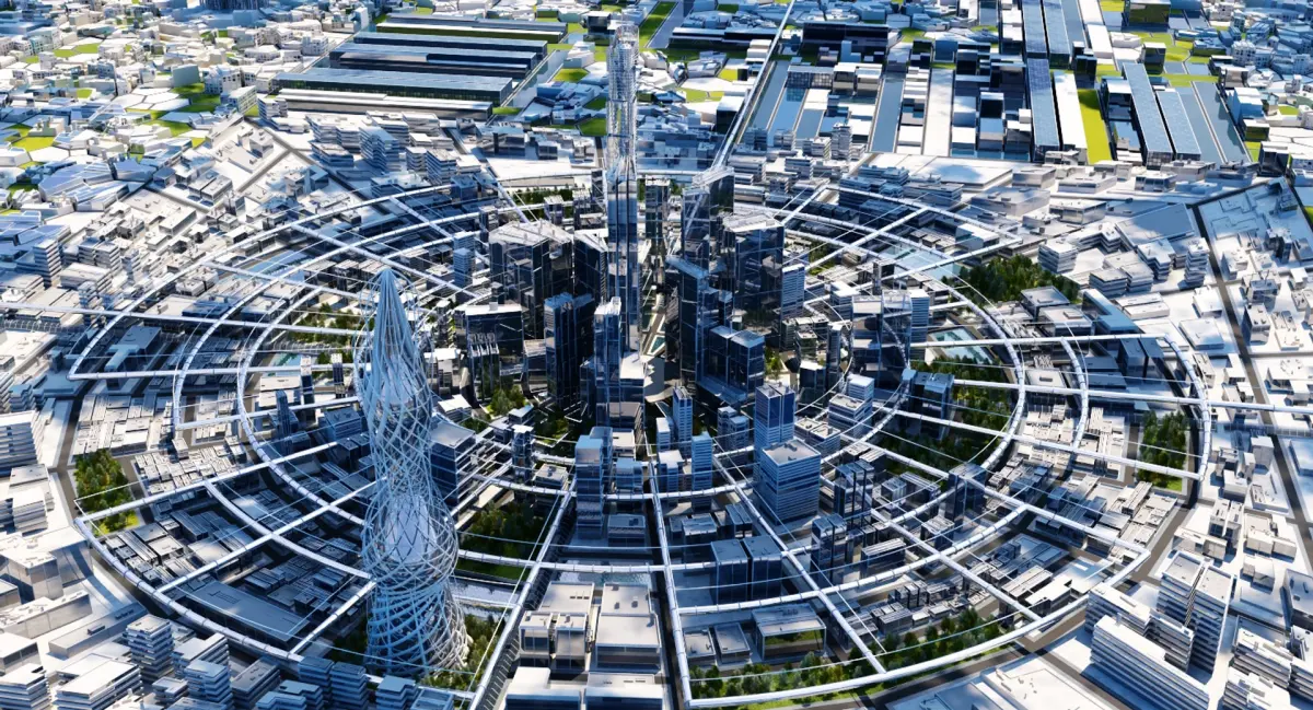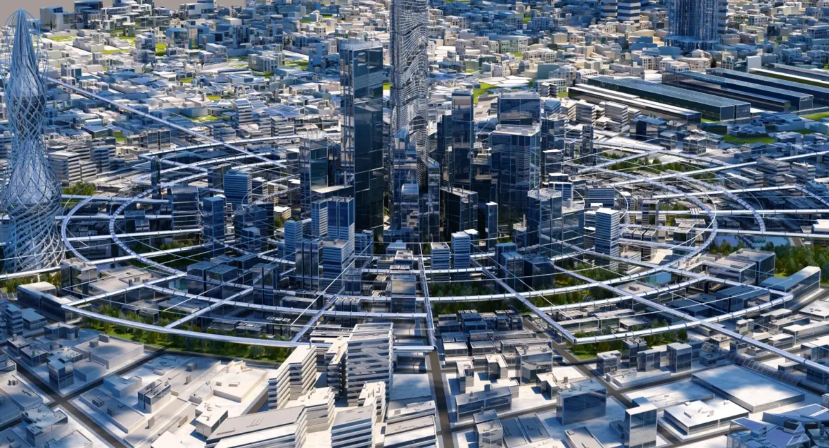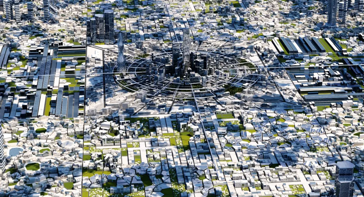 Extremely detailed 3D model of a cityscape of the future.