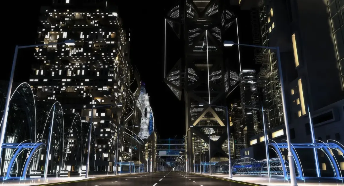Extremely detailed 3D model of a realistic night time cityscape of the future.
