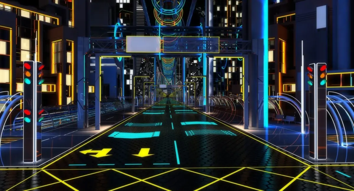 Extremely detailed 3D model of a realistic night time cityscape of the future.