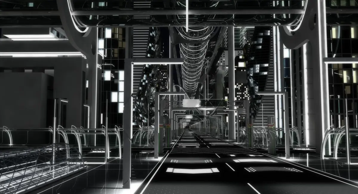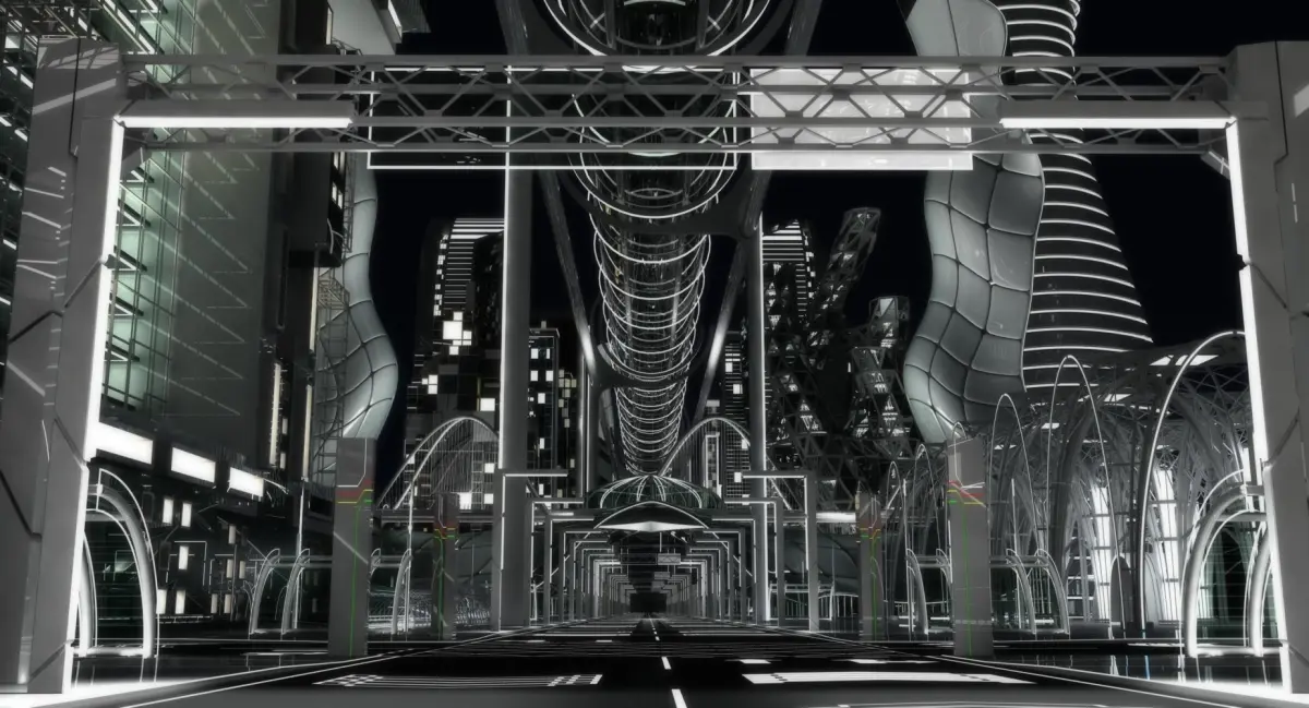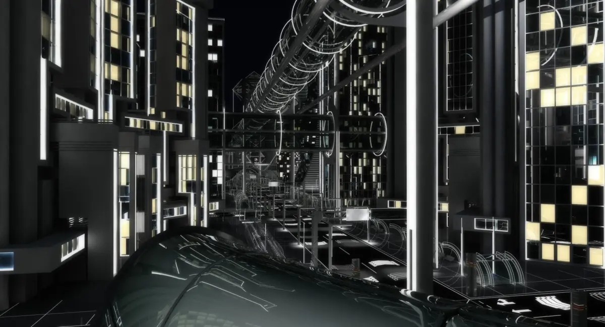 Extremely detailed 3D model of a realistic night time cityscape of the future.
