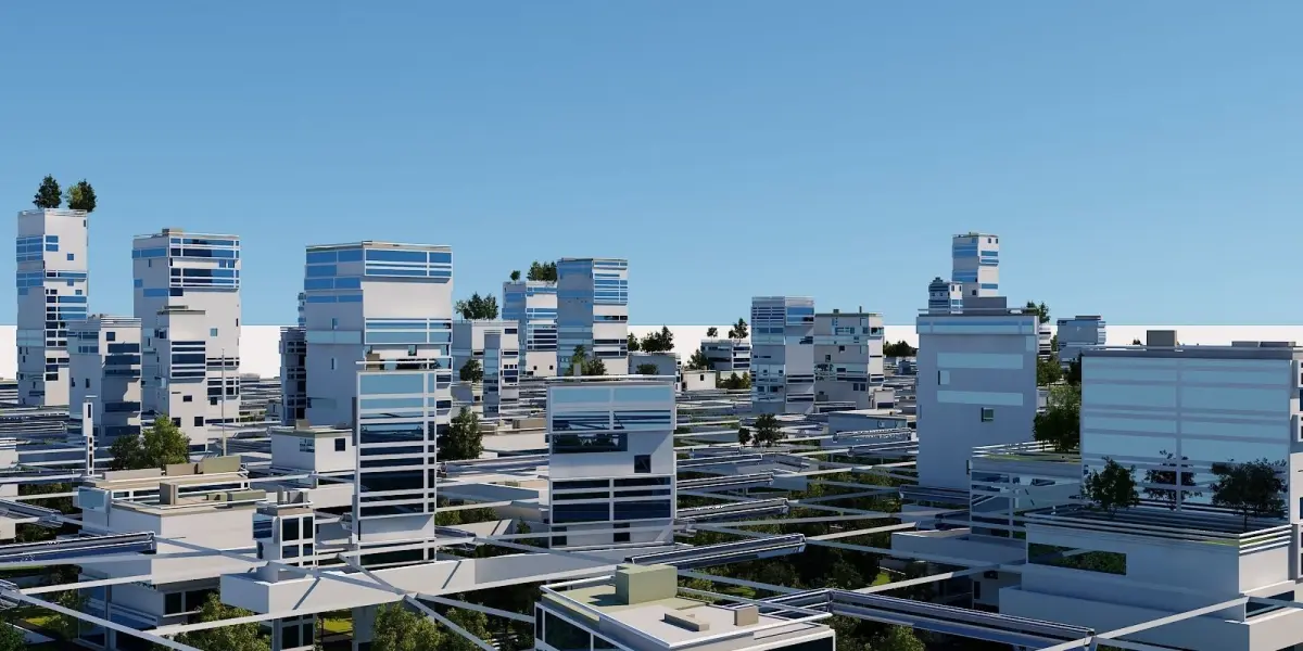 Detailed Futuristic city designed in Houdini and 3dsMax.Houdini source file not included.Rendered with V-Ray Next.Walls, glass, roads, roofs, and grass areas are separated for easy global texturing.Trees are scattered with Pflow in 3ds Max and can be edited.Trees models are also included in file.