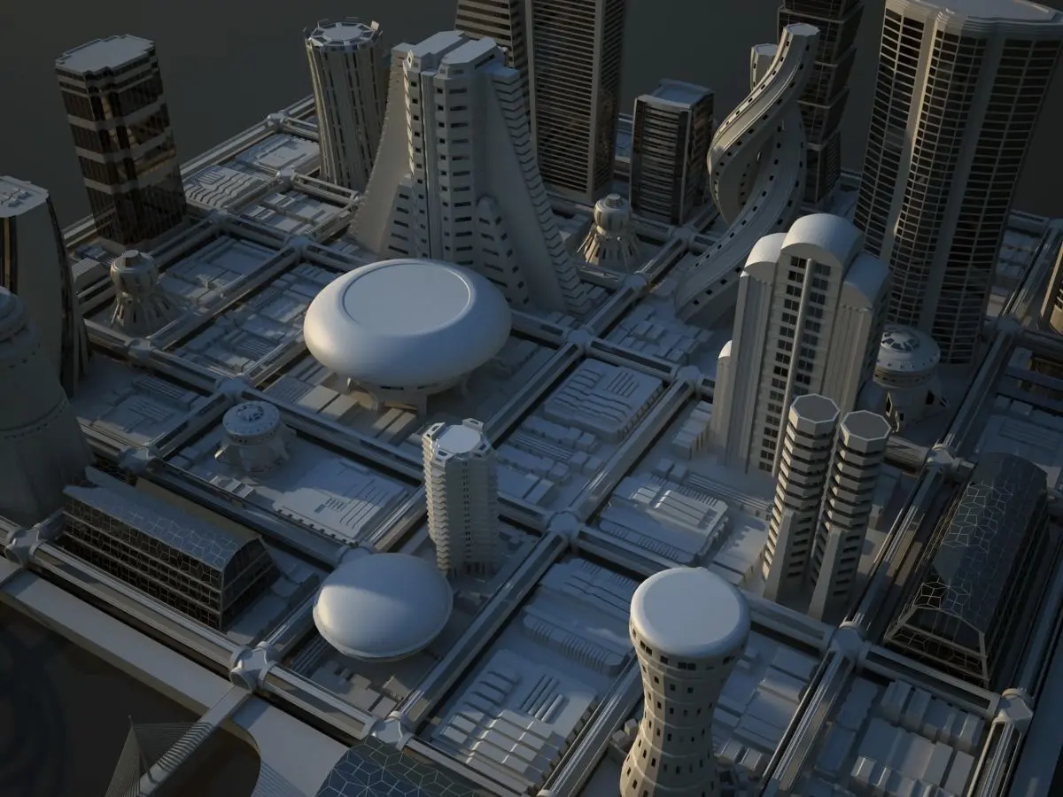Extremely detailed 3D Model of a futuristic cityscape with an integrated road system.