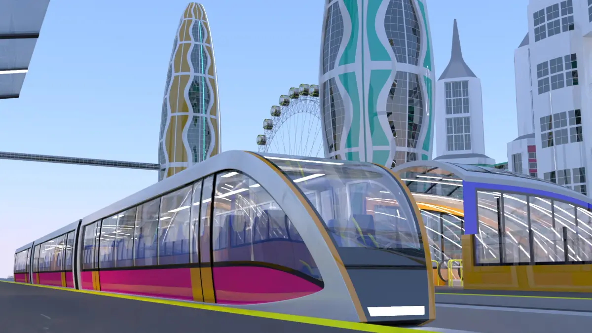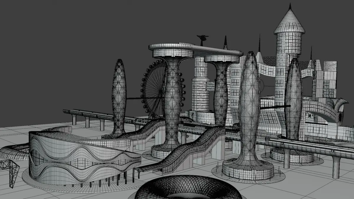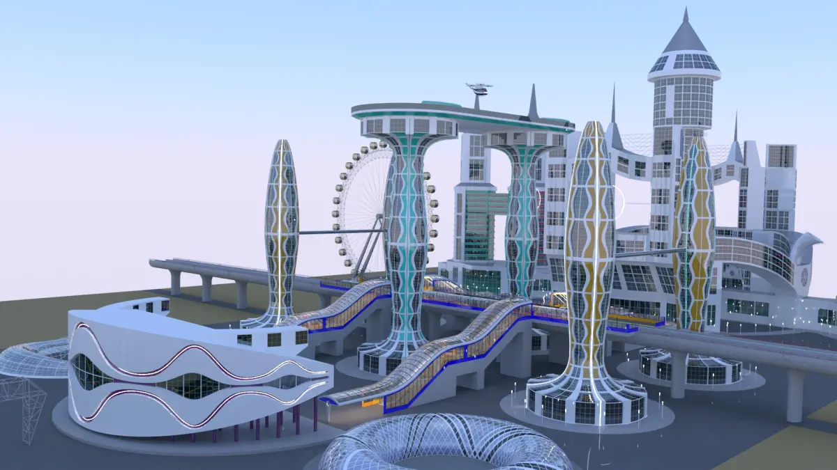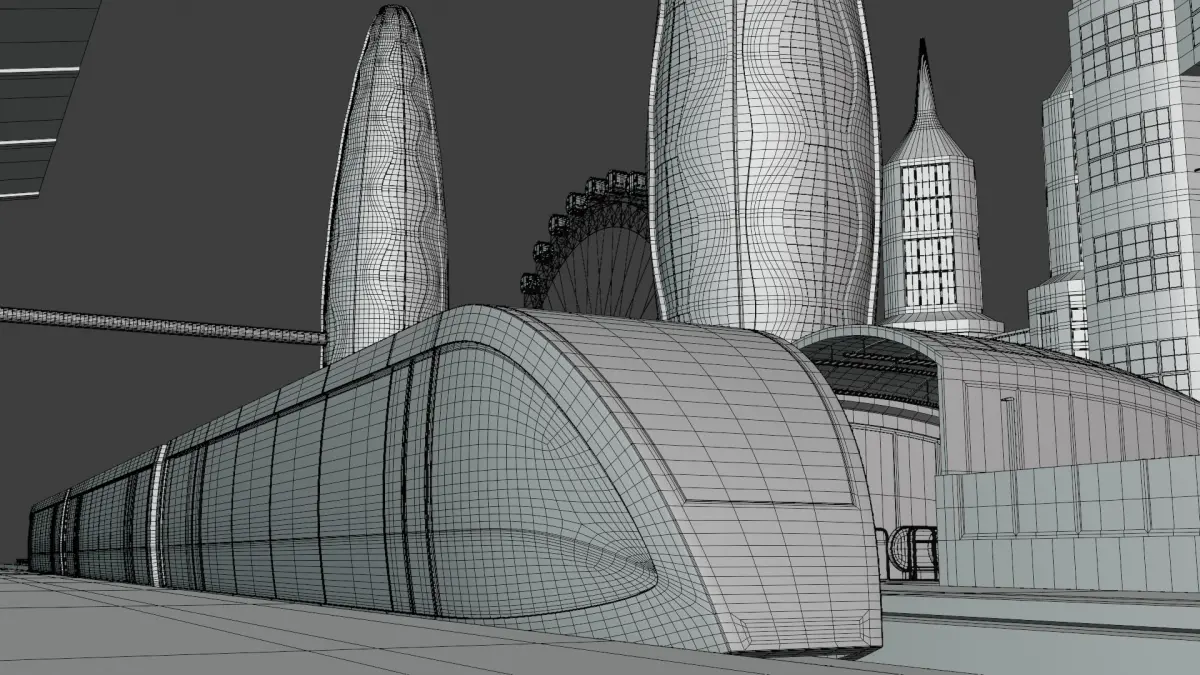 - This is 3D model of future city with monorail.