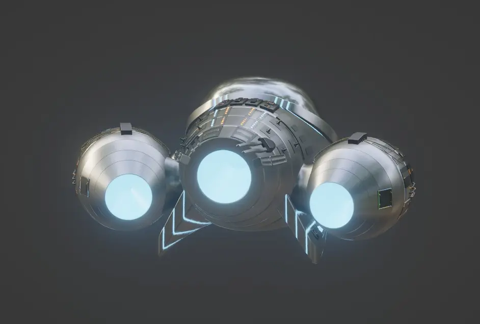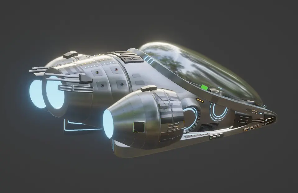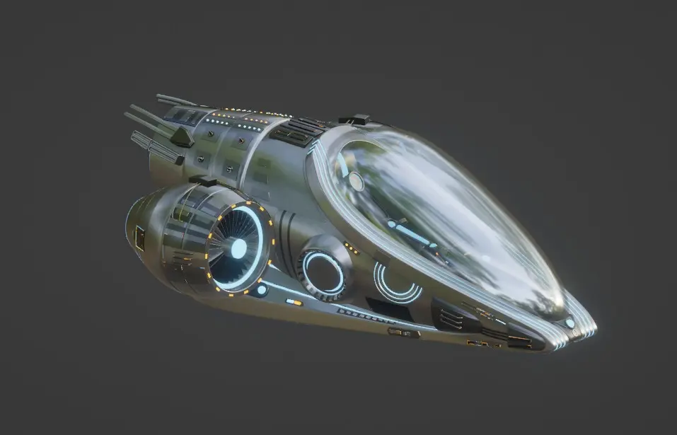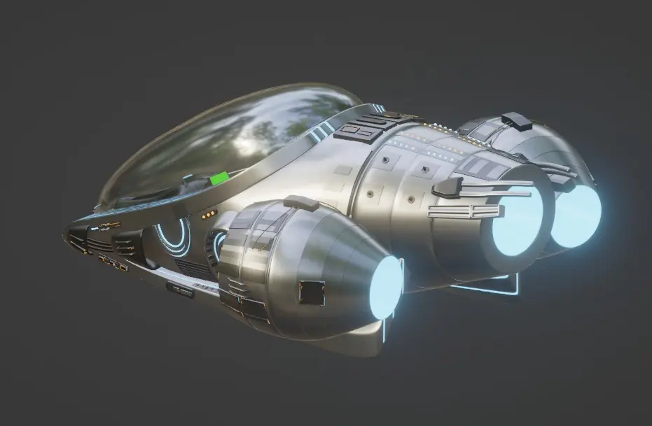 A sleek and futuristic exoplanet exploration vehicle showcases a metallic silver exterior that exudes cutting-edge sophistication. Neon blue lights trace its edges, creating a striking visual against the darkness of space. Equipped with advanced propulsion systems, this vehicle ensures swift and efficient traversal of alien terrains, while its transparent dome cockpit offers breathtaking panoramic views of the cosmos. Designed for long-term missions, it combines durability with state-of-the-art technology, including life-support systems and adaptive navigation tools. Perfectly crafted for interstellar explorers, this vehicle embodies the innovation and ambition of humanity’s distant future, making it a vital companion for cosmic adventures.