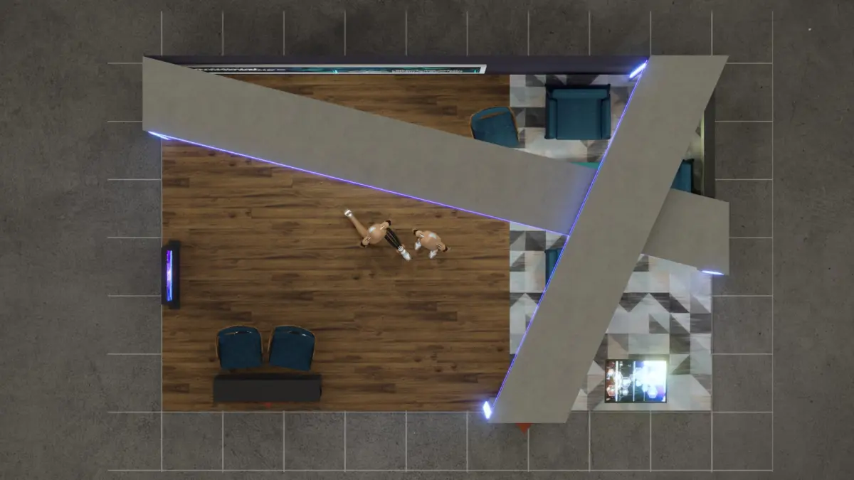 This 3D model represents a cutting-edge exhibition stand, designed specifically for AI and advanced technology presentations. The design includes a modern reception desk, interactive display units, and detailed humanoid robot figures to attract attention at any event or fair. The sleek, minimalist architecture is complemented by soft LED lighting, adding a futuristic ambiance to the setup. The stand also features a lounge area with modern furniture, creating a welcoming space for client interactions or product demonstrations.