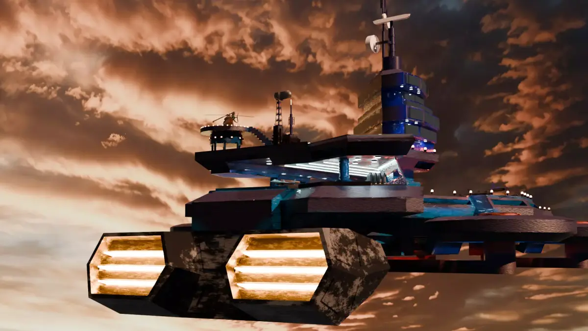 This model is a futuristic aircraft carrier combining military functionality with a strong sci-fi aesthetic. It features a multi-level command tower equipped with radars, antennas, and observation platforms, along with defensive turrets, landing strips, and circular engine modules that give the carrier a highly advanced and realistic appearance.