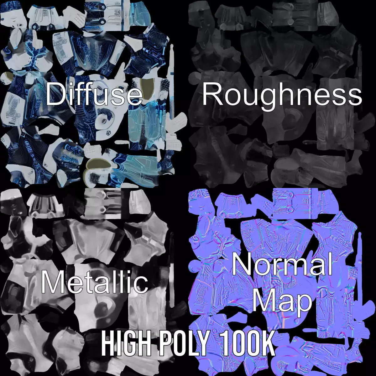 The Futuristic Android model pack showcases a sleek design embodying cutting-edge technology, perfect for sci-fi scenes or games. Each model has 3 levels of detail: low-poly (1000 triangles for mobile), mid-poly (10,000 triangles for environment), and high-poly (100,000 triangles), which allows the model to be utilized in production rendering (such as 3ds Max, Maya, Cinema4D, Blender, Vray/Corona/Cycles), game engines (Unity and Unreal compatible), and interactive presentations, offering a choice based on the LOD system principle. This android is ideally suited for futuristic environments, robotics simulations, or educational purposes. The model's textures are PBR, Diffuse, NormalMap, and reflection/roughness/metallic, compatible with any modern rendering engine. All models are accurately unwrapped with no overlapping UVs. All textures are 4096*4096 in size. Please like and leave a comment if you enjoyed the model.