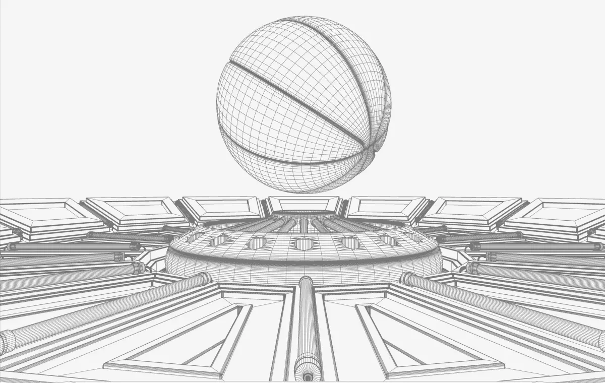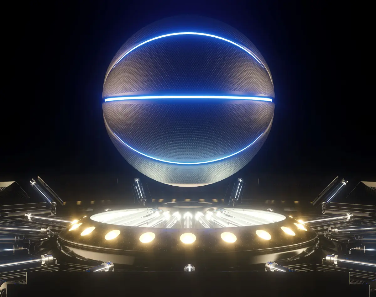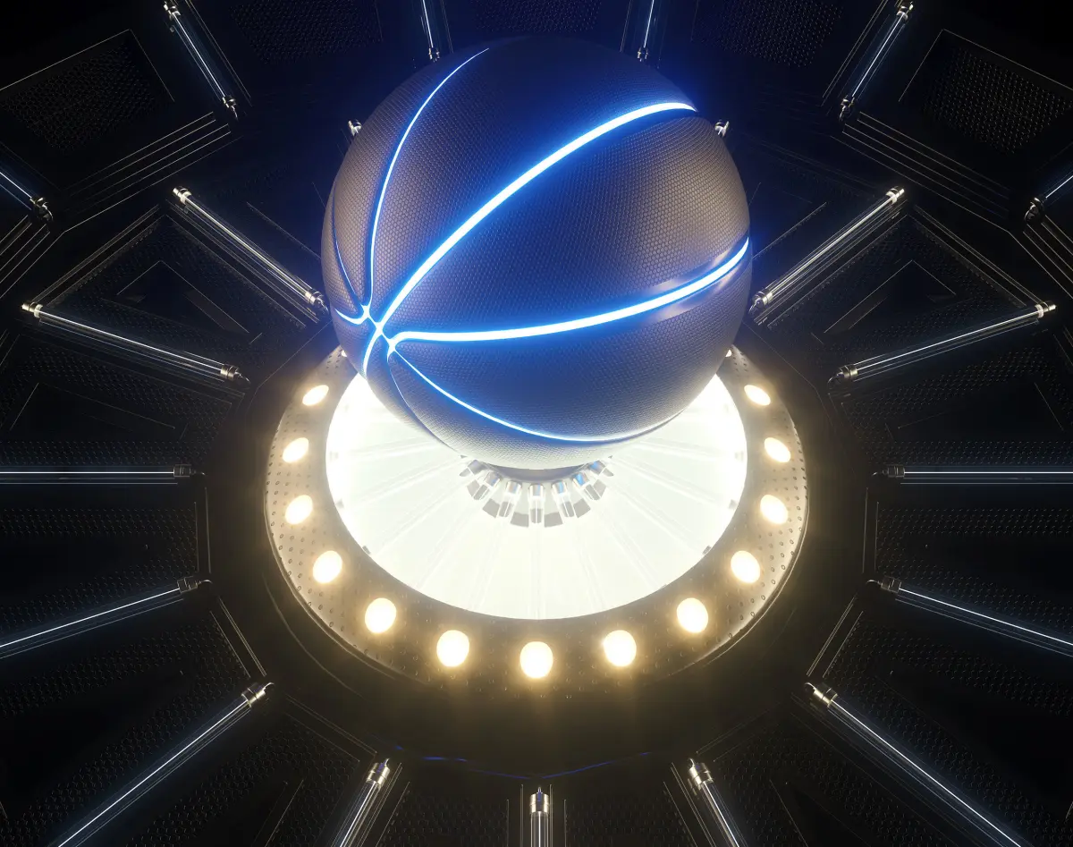 A futuristic sports concept of a basketball ball lit with neon markings floating above a futuristic neon portal stage. Created natively in Cinema 4d and rendered with Redshift. May contain procedural and parametrized meshes which may translate to higher poly count than stipulated if converted to other formats.