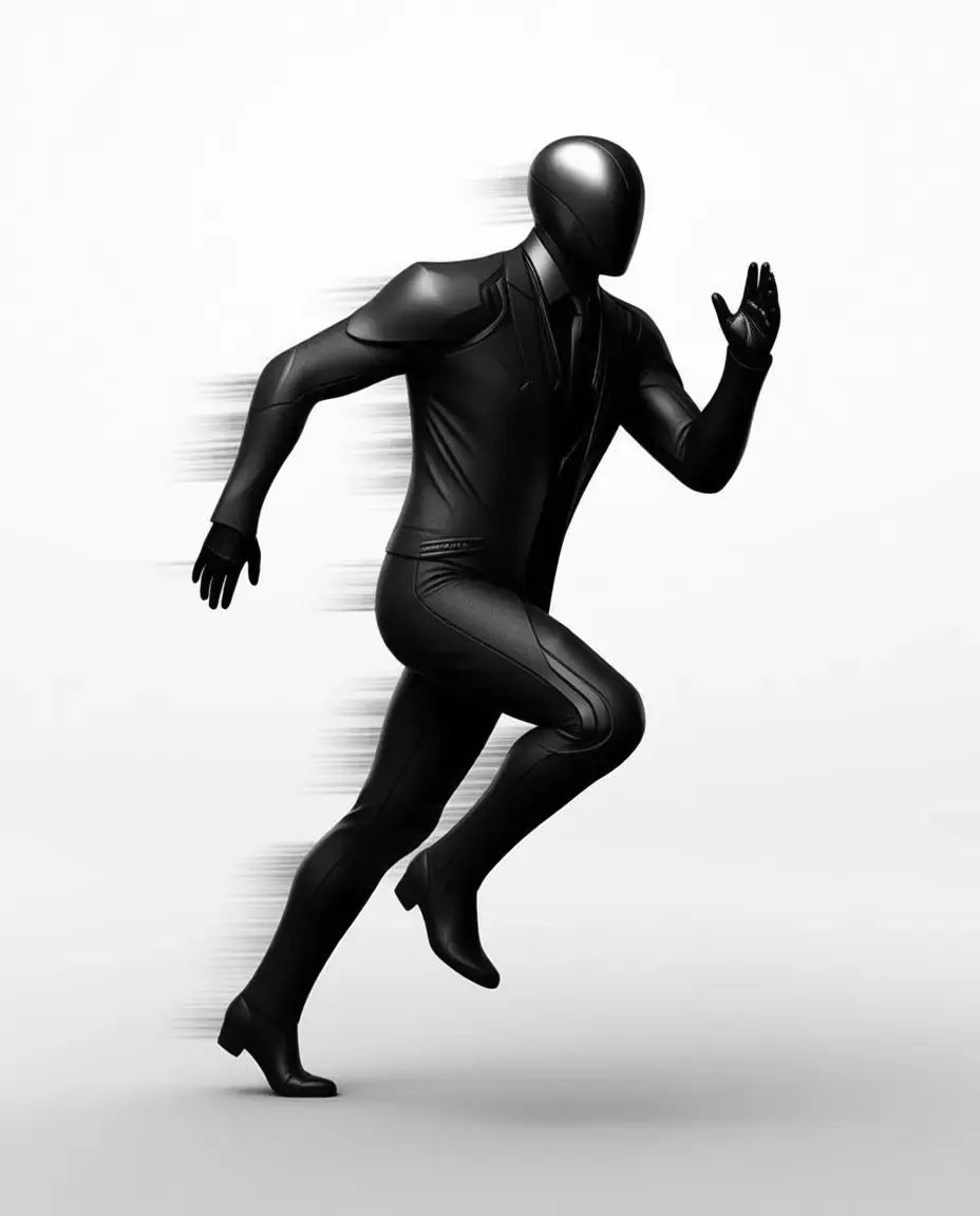 Ultra-realistic 3D model of a futuristic black suit, designed as a powerful and elegant digital asset that blends advanced technology with human form. The figure features a sleek, streamlined body rendered in smooth, glossy black material—resembling polished plastic or composite resin—with subtle panel lines and joints that highlight its mechanical nature. Its head is elongated and angular, with glowing blue eyes that add a touch of life and intelligence to its expression.