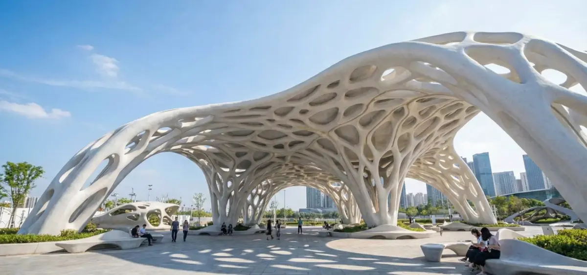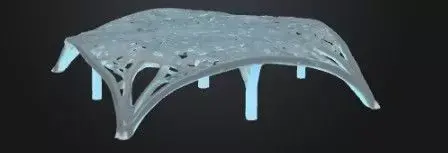 This 3D model represents a futuristic organic pavilion designed with a parametric aesthetic inspired by natural branching systems and fluid geometry.The structure features smooth organic curves, perforated patterns, and four sculptural legs that distribute the load in a biomimetic manner, making it ideal for conceptual architecture, CGI visualization, sci-fi environments, and environmental design presentations.